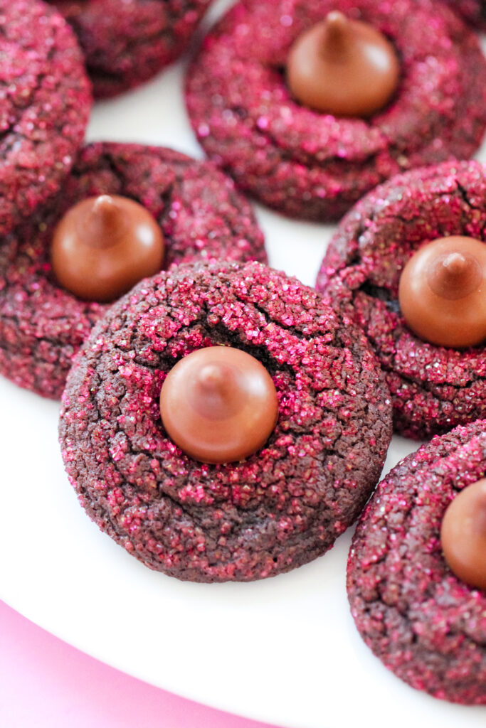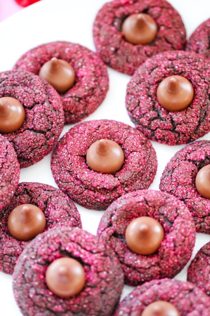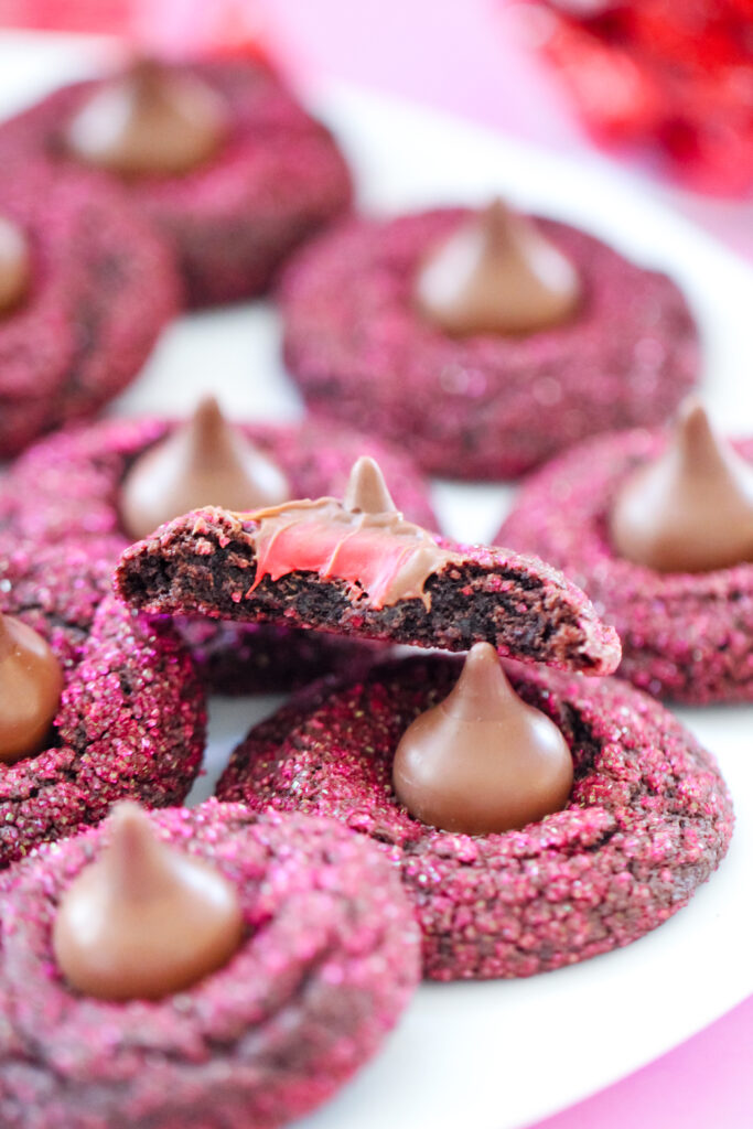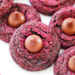 Berry-Kissed Dark Chocolate Cookies are the perfect way to try the seasonal Hershey’s Kiss flavor. The cookie base is rich and dark thanks to Dutch-processed cocoa, while the strawberry Kiss on top adds a pop of color and just the right touch of sweetness. They’re a classic blossom cookie, all dressed up for Valentine’s Day.