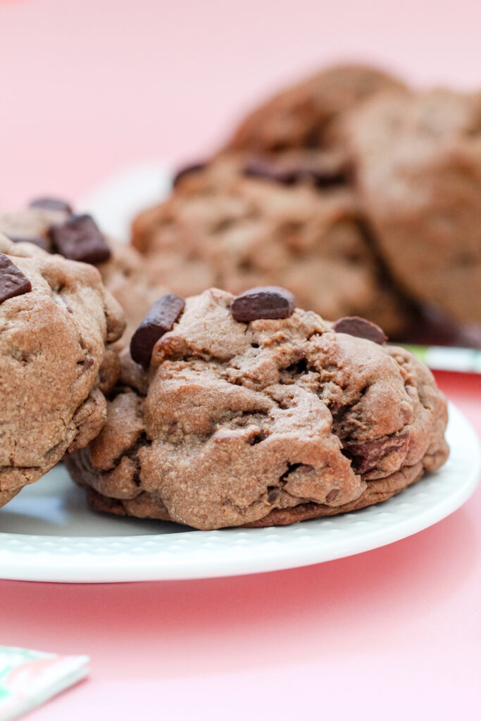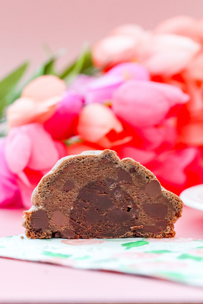 The brownie core center is baked right inside the cookie. Instead of mixing brownie pieces into the dough, there’s a full, soft center inside each cookie, so every bite has that contrast between cookie and fudgy filling.