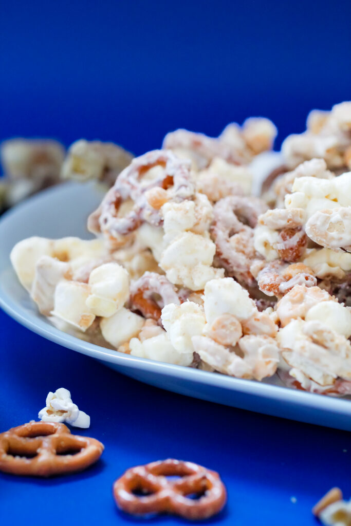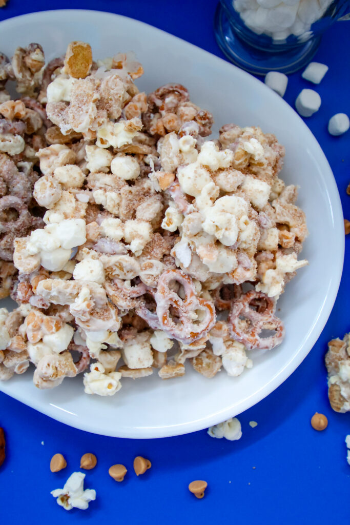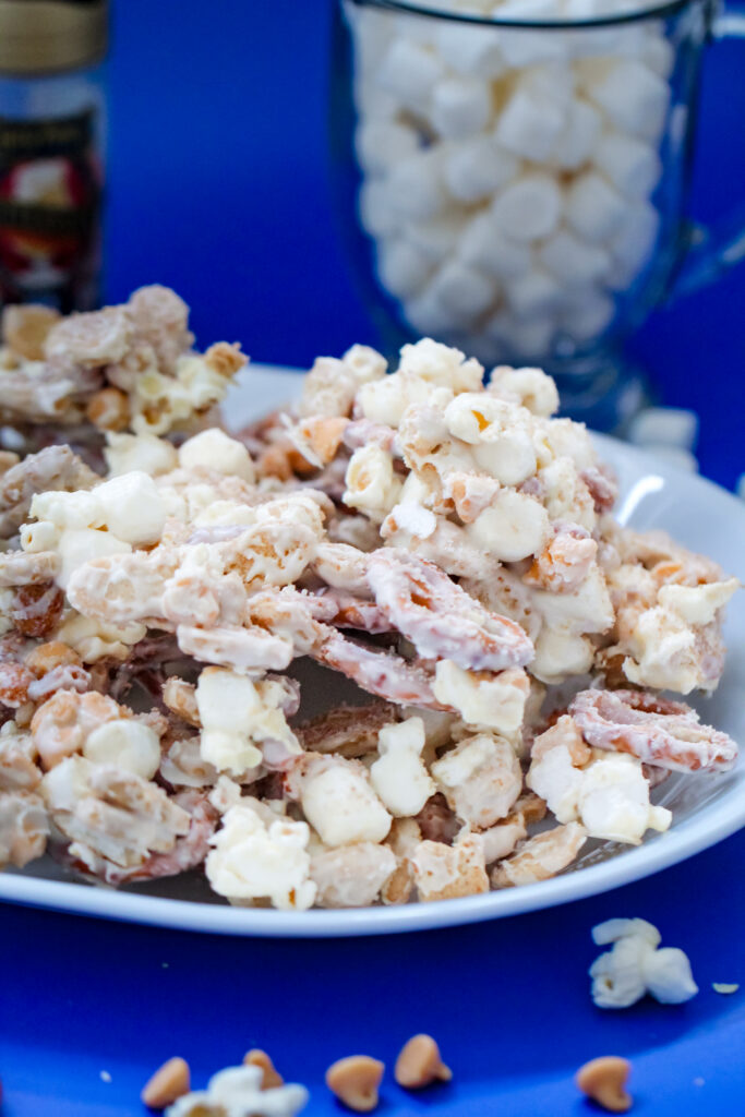 This mix leans sweet first, thanks to the white chocolate and butterscotch chips, but it’s balanced by the pretzels, popcorn, and that light saltiness from the Goldfish. The marshmallows soften slightly once everything sets, giving little chewy bites throughout. The finishing sugar adds a subtle sparkle and just a hint of extra sweetness that pulls everything together.