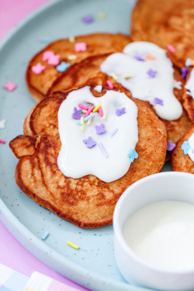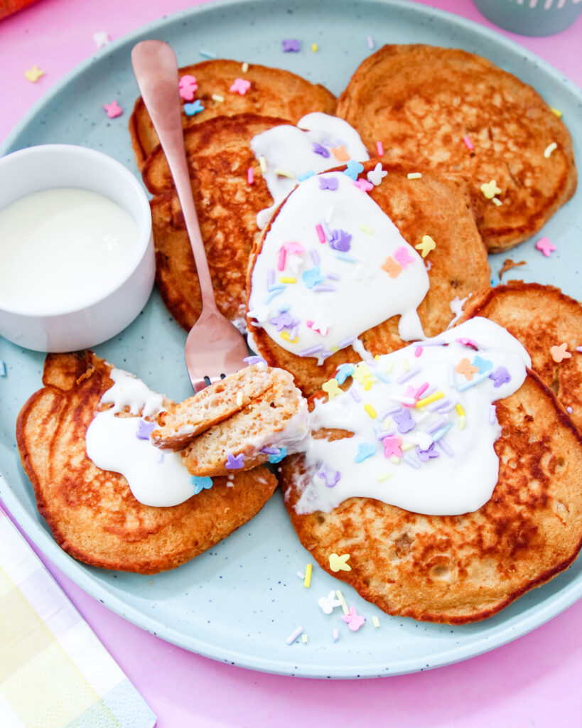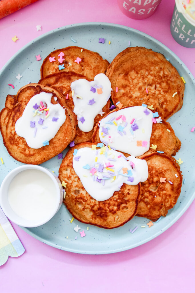 If you’re hosting a spring brunch or Easter morning at your house, these pancakes are such a fun way to make the table feel a little more special. I love stacking them high on a pretty plate, drizzling on the cream cheese glaze, and adding a few fresh berries just to make everything feel bright and happy. Pair them with fruit salad, some scrambled eggs, and a pitcher of lemonade or iced tea, and suddenly it feels like a full-on spring celebration.