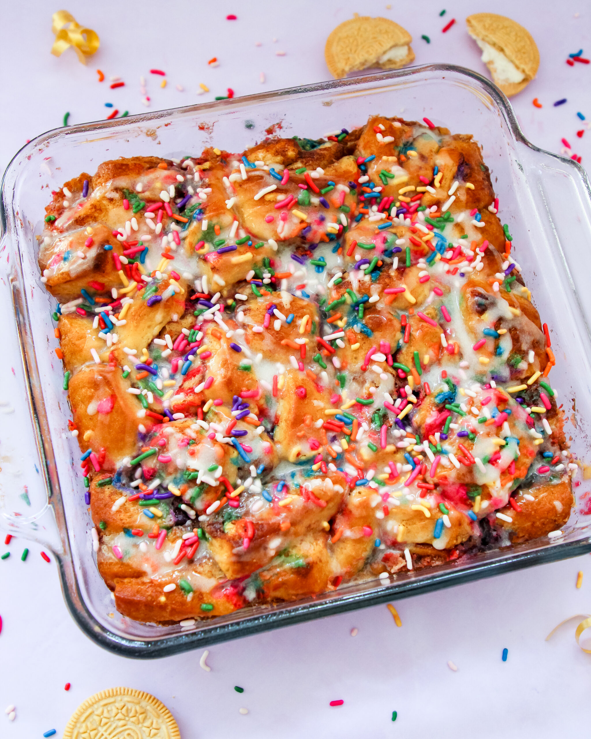 Birthday Cake Oreos filled with edible cookie dough, dipped in chocolate, and topped with rainbow sprinkles!