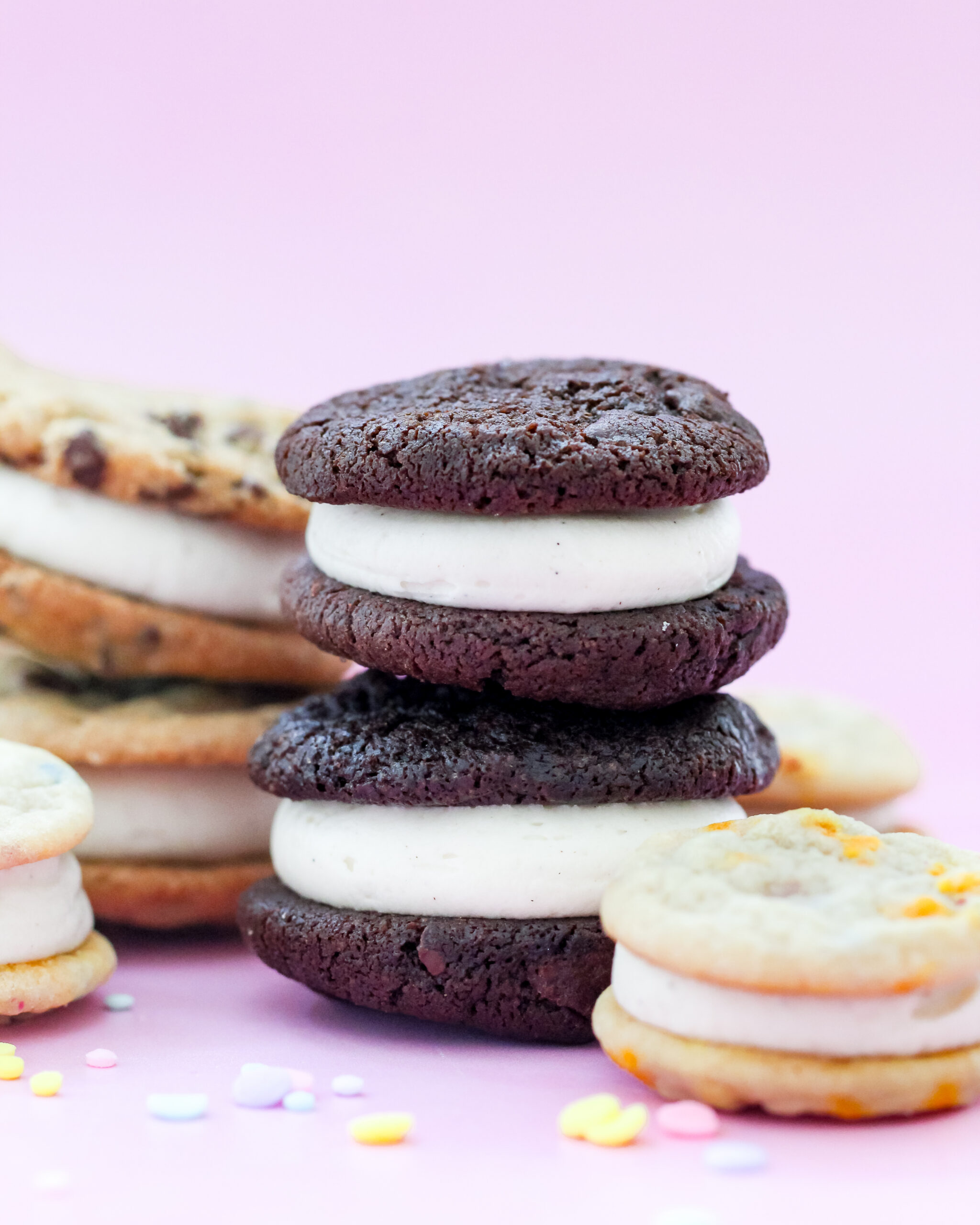 Birthday Cake Oreos filled with edible cookie dough, dipped in chocolate, and topped with rainbow sprinkles!