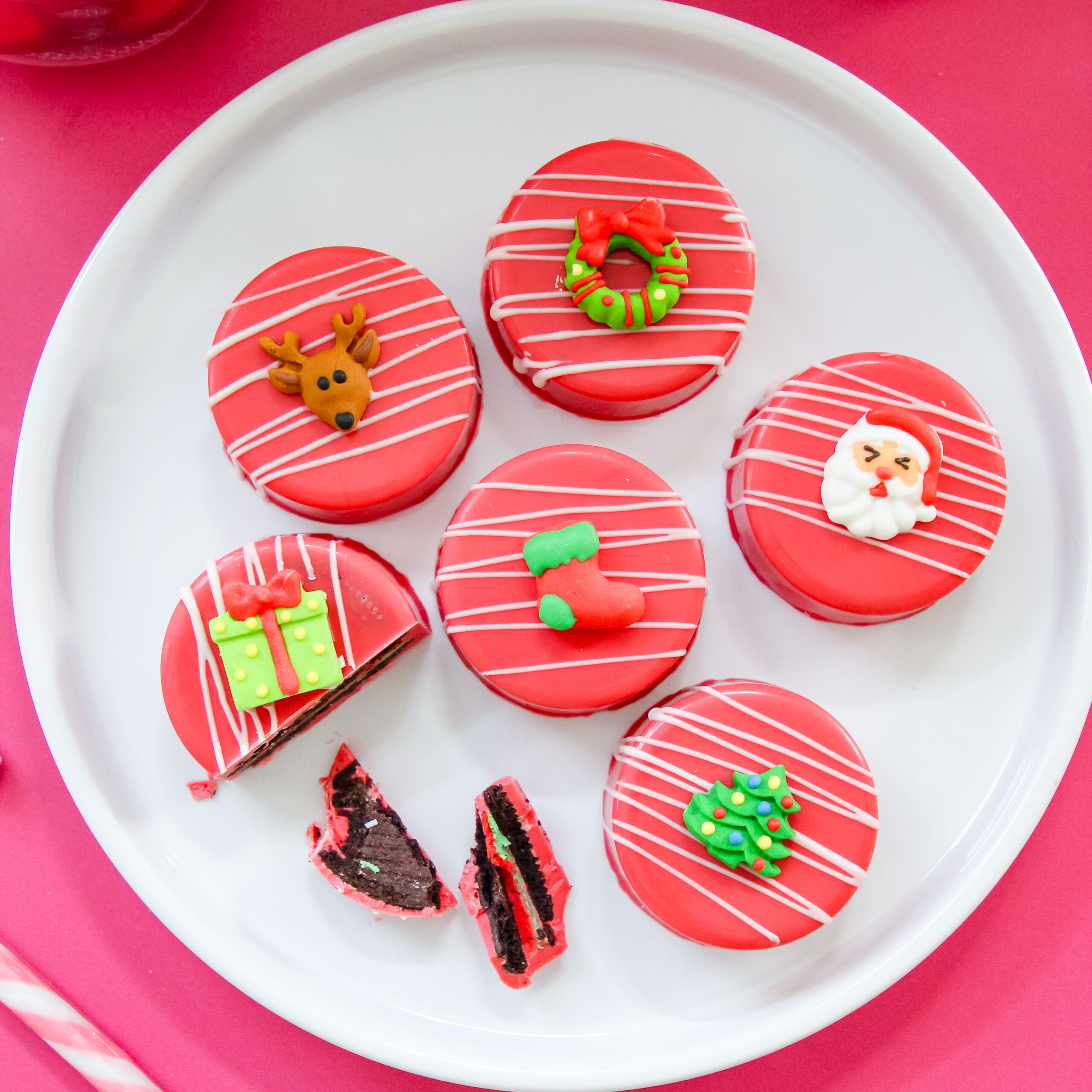 Birthday Cake Oreos filled with edible cookie dough, dipped in chocolate, and topped with rainbow sprinkles!