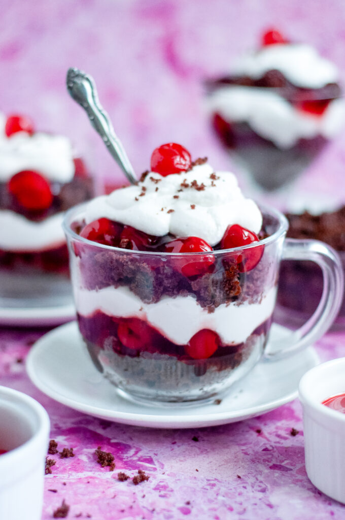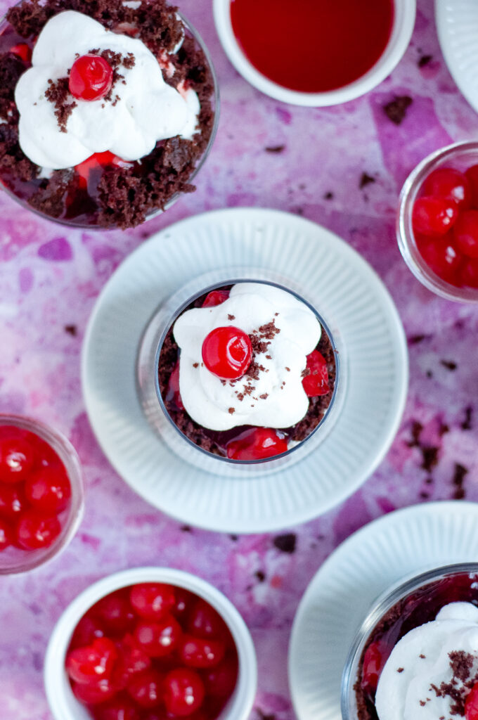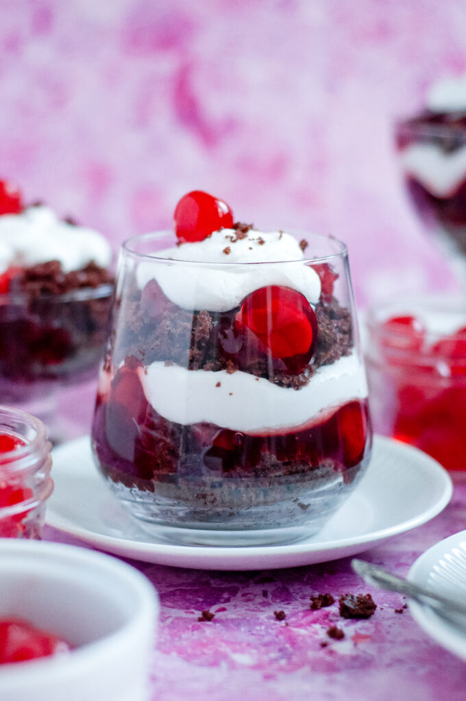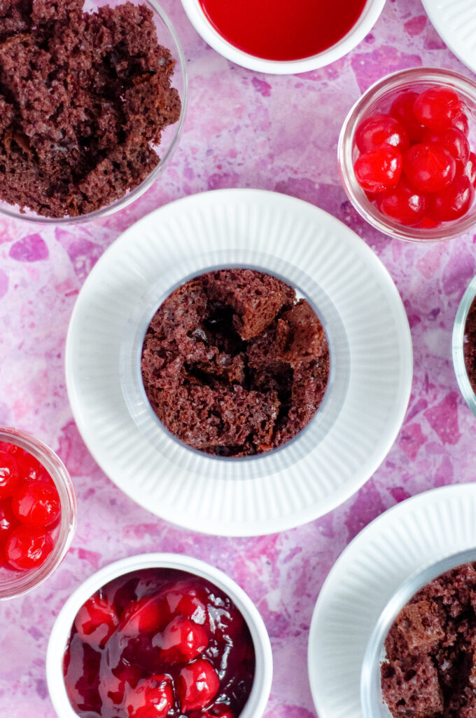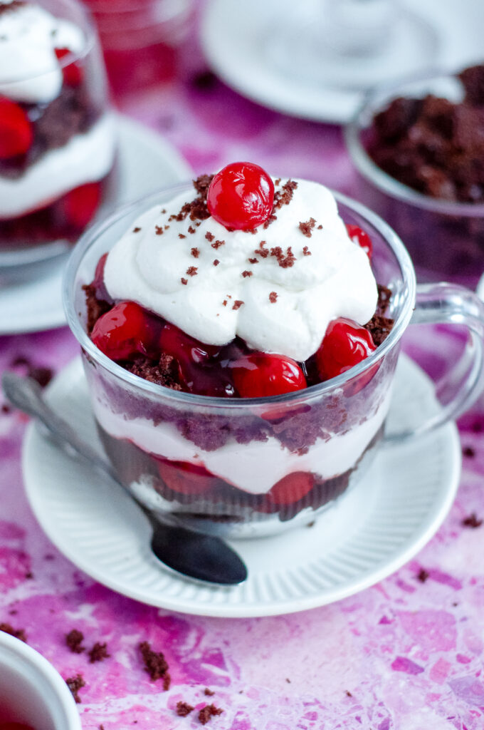 Make a batch of Cherry Jubilee Cake Cups for a laid-back weekend movie watch party and lean into a little old-school fun. Serve them in clear cups or vintage-style glasses, pop on a few classic 1960s favorites like Breakfast at Tiffany’s, The Sound of Music, or Charade, and keep things simple with cozy seating and dim lights. It’s the kind of dessert that feels right at home with a classic movie lineup.