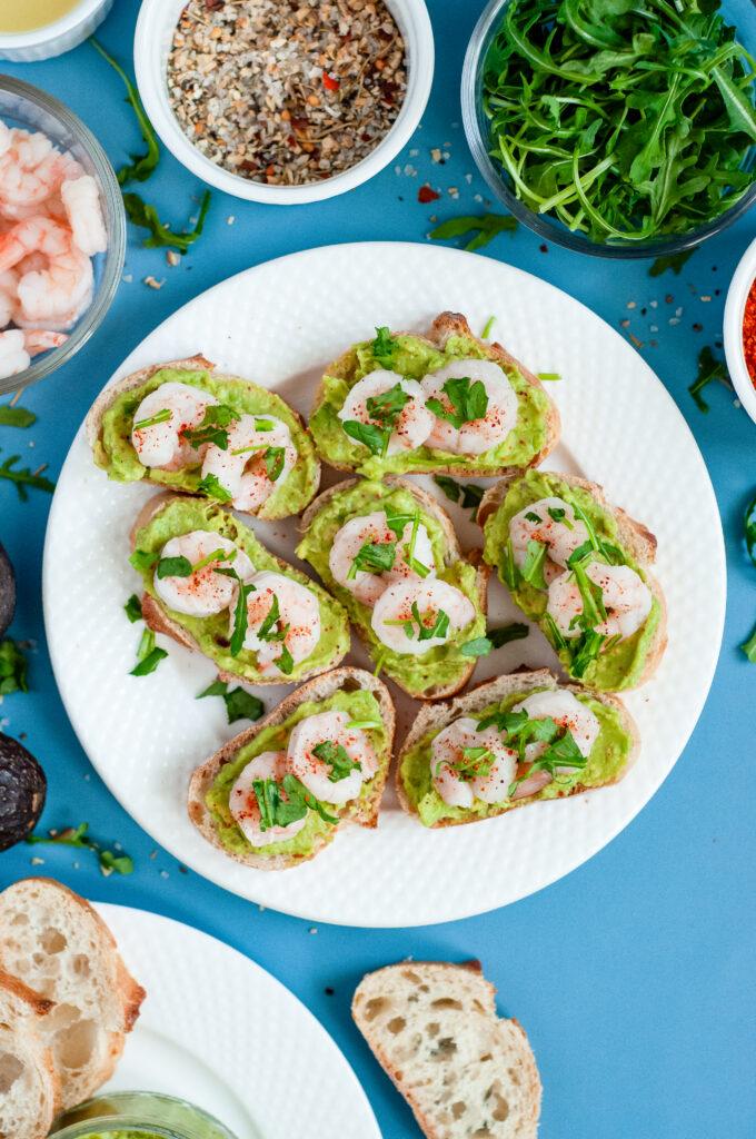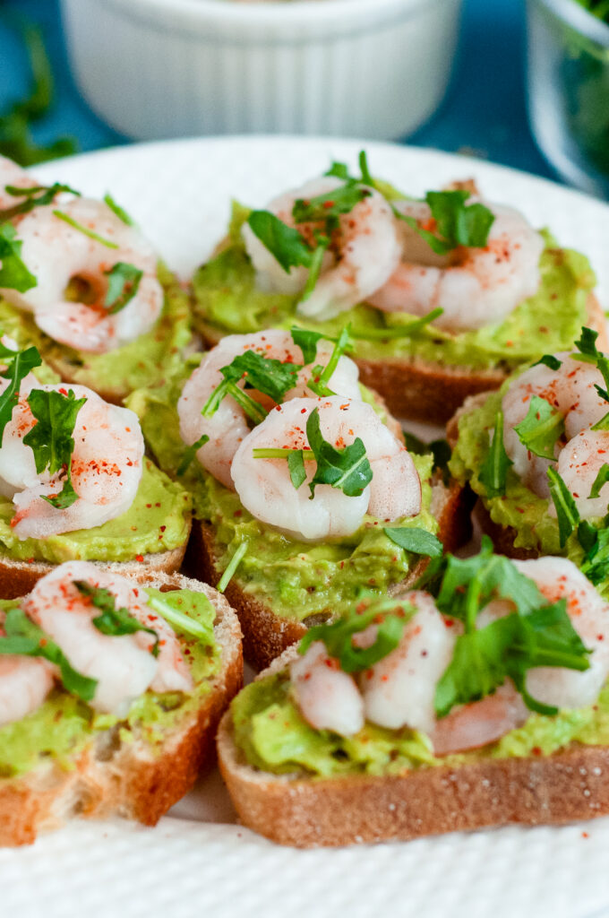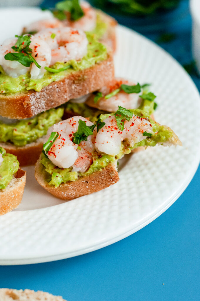 These crostini are fresh, citrusy, and savory with just the right kick. The avocado is creamy and smooth with a pop of lime. The shrimp are tender and slightly sweet. The chili-lime seasoning adds a gentle heat and tangy edge that keeps everything from tasting flat. The toasted baguette brings crunch and structure, so you get creamy, crisp, and juicy all in one bite.