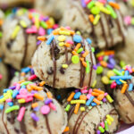 Birthday Cake Oreos filled with edible cookie dough, dipped in chocolate, and topped with rainbow sprinkles!