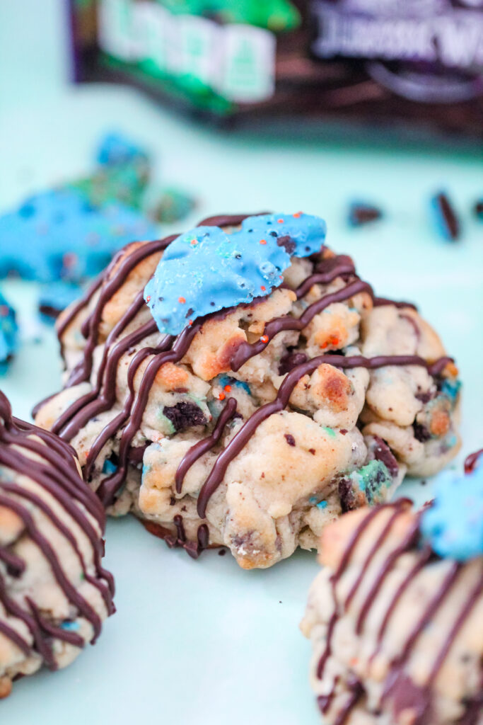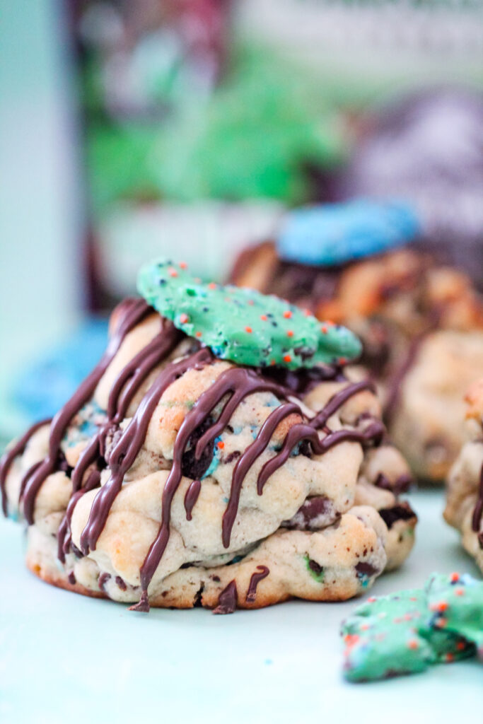 These Dynamite Dino Jumbo Cookies are thick, chunky, and ready to stomp into your dessert lineup. Each one is packed with chocolate pieces and crushed Mother’s Dynamite Dinosaurs cookies for a cookie-within-a-cookie moment that feels like digging up hidden fossils. Press a whole dino on top of drizzled chocolate, and suddenly you have a bakery cookie that looks like it escaped from a prehistoric theme park. Big, bold, and full of chocolate, these are the kind of cookies that take over the plate and make dessert feel like an adventure.
