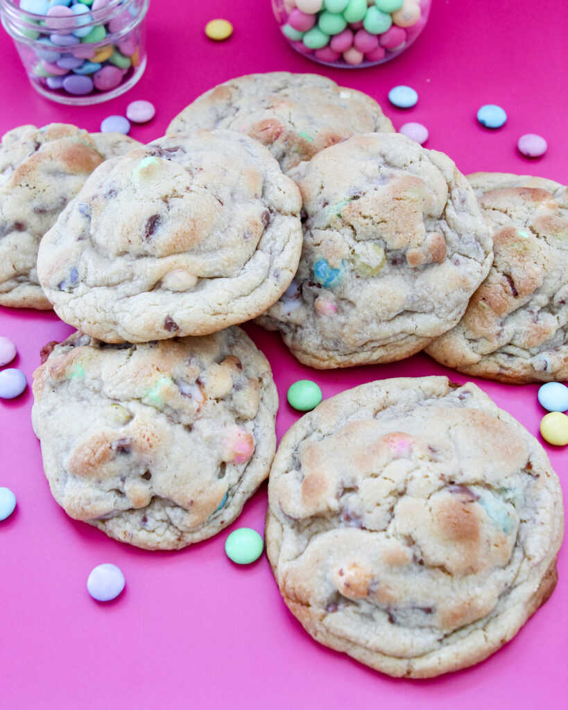 These cookies lean rich and buttery with a soft vanilla base that lets all the mix-ins shine. You get creamy chocolate from the Cadbury eggs, a little crunch from the candy shells, and soft, melty bites from the marshmallow pieces. Every bite hits slightly different, which is a texture-lover’s dream.