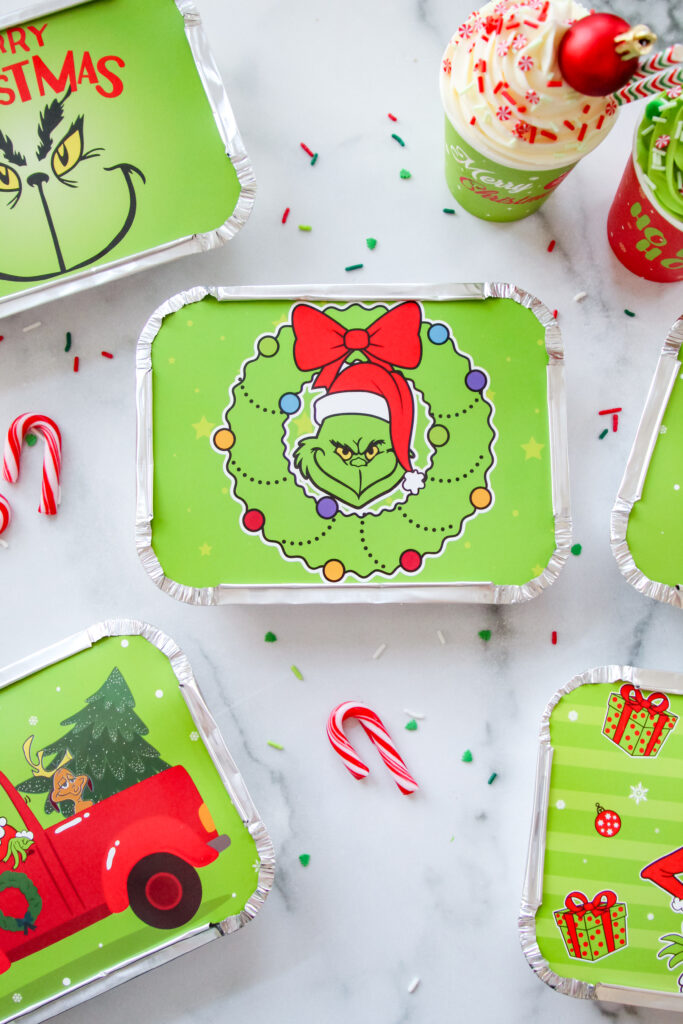 Grinch foil pans work beautifully on their own, but you can also add clear cellophane wrap with a ribbon for an extra festive finish.