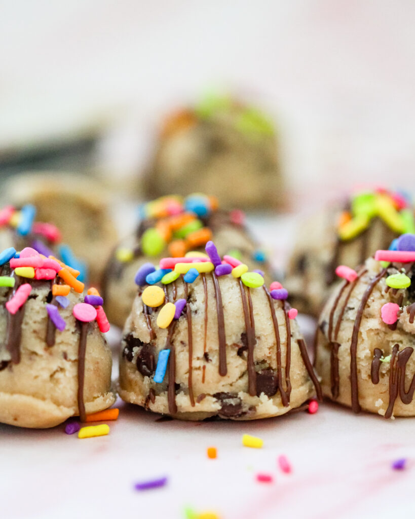 Birthday Cake Oreos filled with edible cookie dough, dipped in chocolate, and topped with rainbow sprinkles!