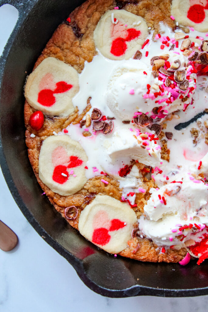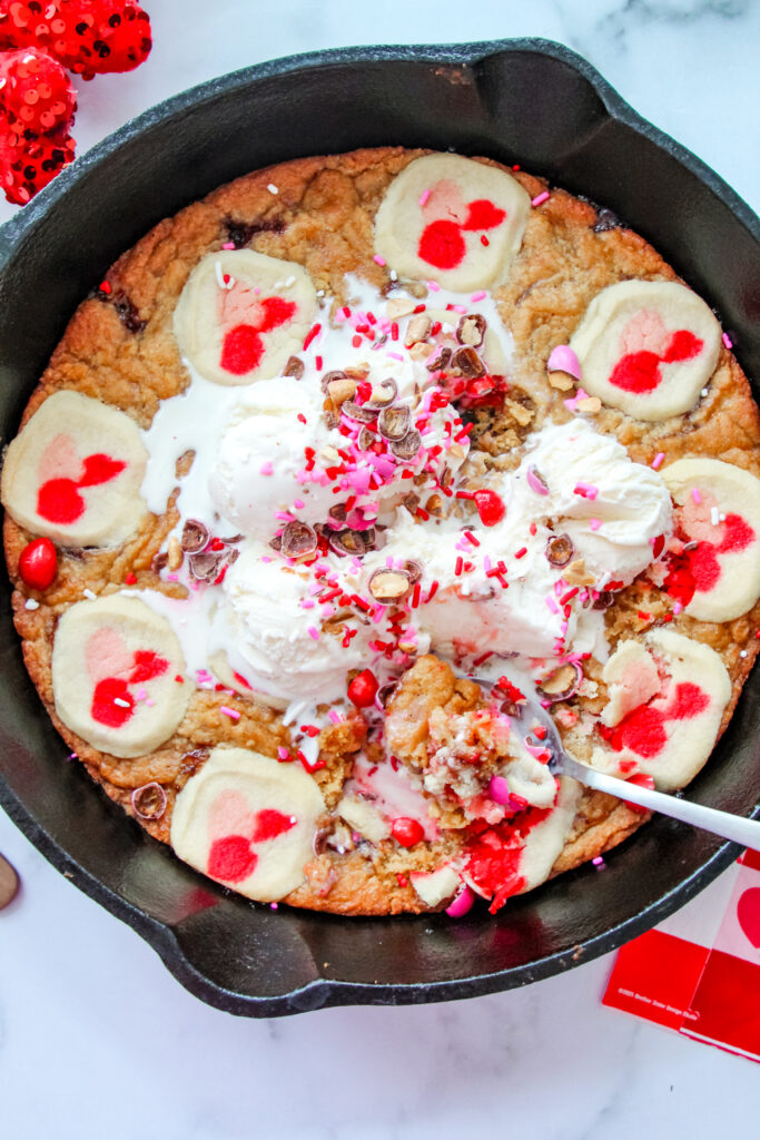 Love at First Bite Cookie Skillet is the kind of dessert that instantly feels like Valentine’s Day. Warm peanut butter and jelly cookie dough and sweet sugar cookies bake together in one cozy skillet, then get topped with ice cream, sprinkles, and Valentine’s M&M’s Peanuts. It’s the perfect shareable treat for your true love, your best girlfriends, or a fun date night with your kids.