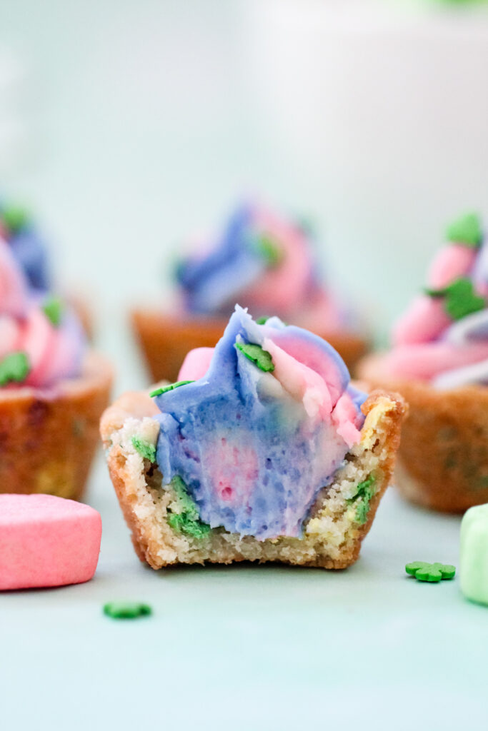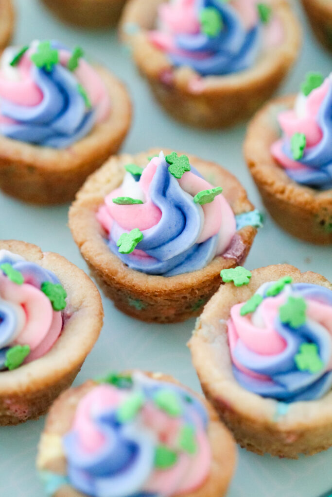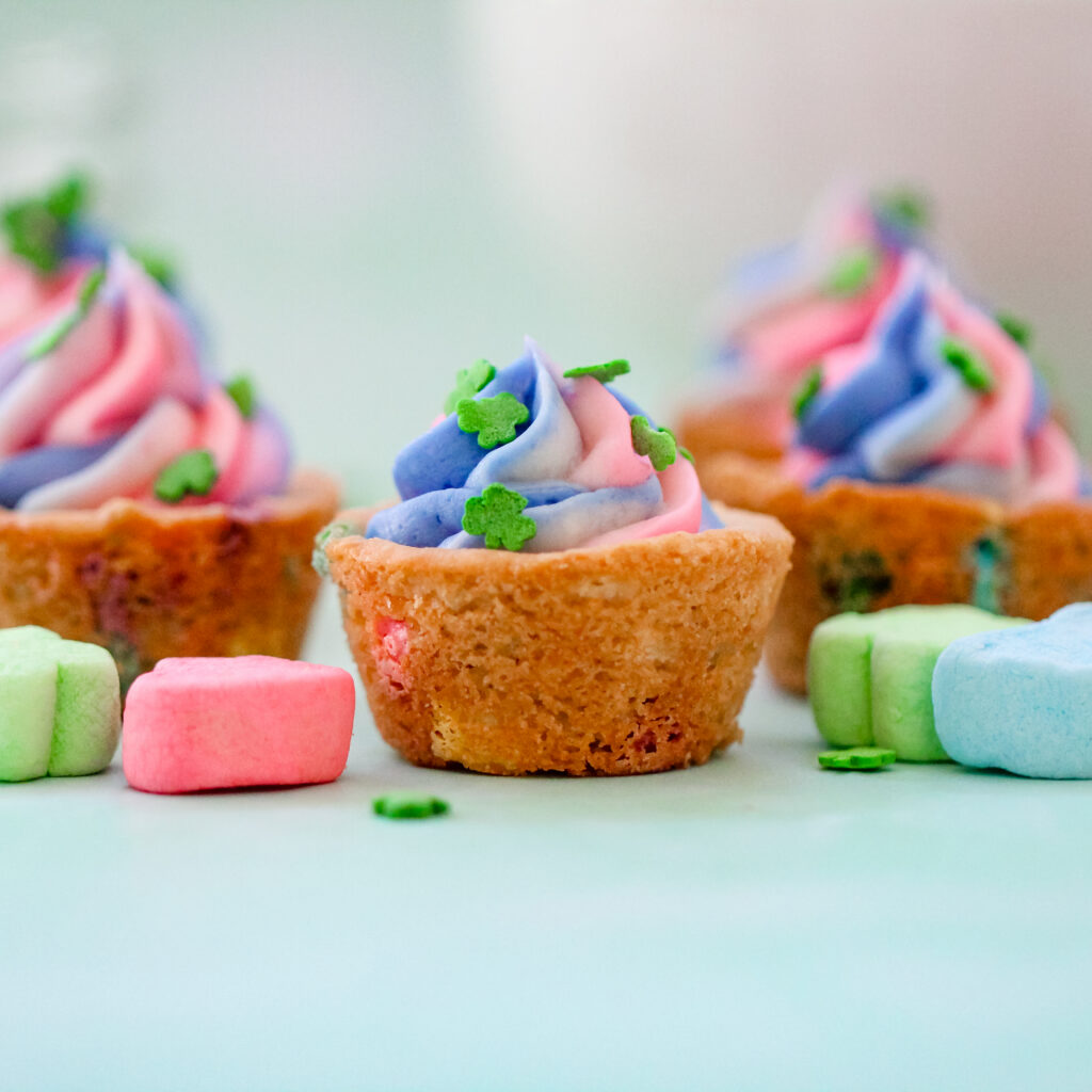 These Lucky Charms Swirl Cookie Cups are a kid’s St. Patrick’s Day dream. Soft cookie bases that actually taste like Lucky Charms, topped with tall swirls of pastel buttercream and finished with shamrock sprinkles. They’re bright, festive, and completely leprechaun-ready.