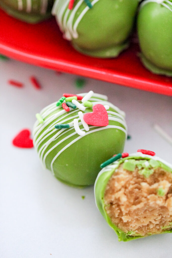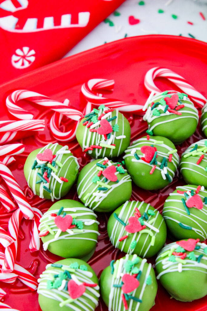 If the Grinch ever decided to trade in his sleigh for a dessert tray, these Merry Mischief Truffles would be his signature treat. They start with crushed Golden Oreos and cream cheese for a smooth, cookie-dough texture, then get dipped in Grinch-green chocolate and finished with a white drizzle and a single red heart. They’re irresistibly fun—just the kind of dessert to make your heart grow three sizes.