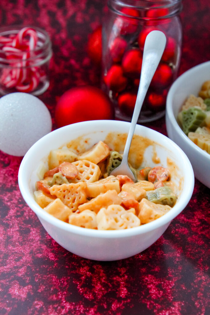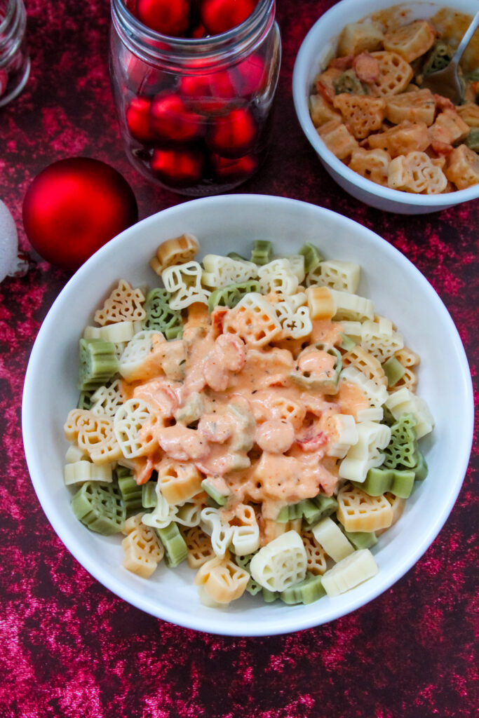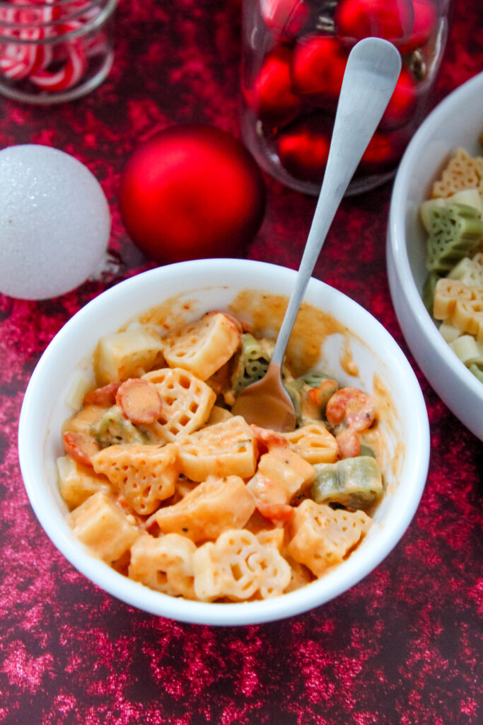 Use sturdy Christmas-shaped pasta made from durum wheat so it holds its shape and doesn’t turn soft in the creamy sauce. Small shells, rotini, or bowties work well if holiday shapes aren’t available.