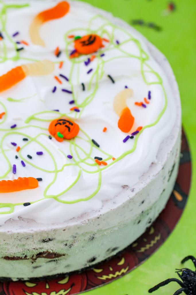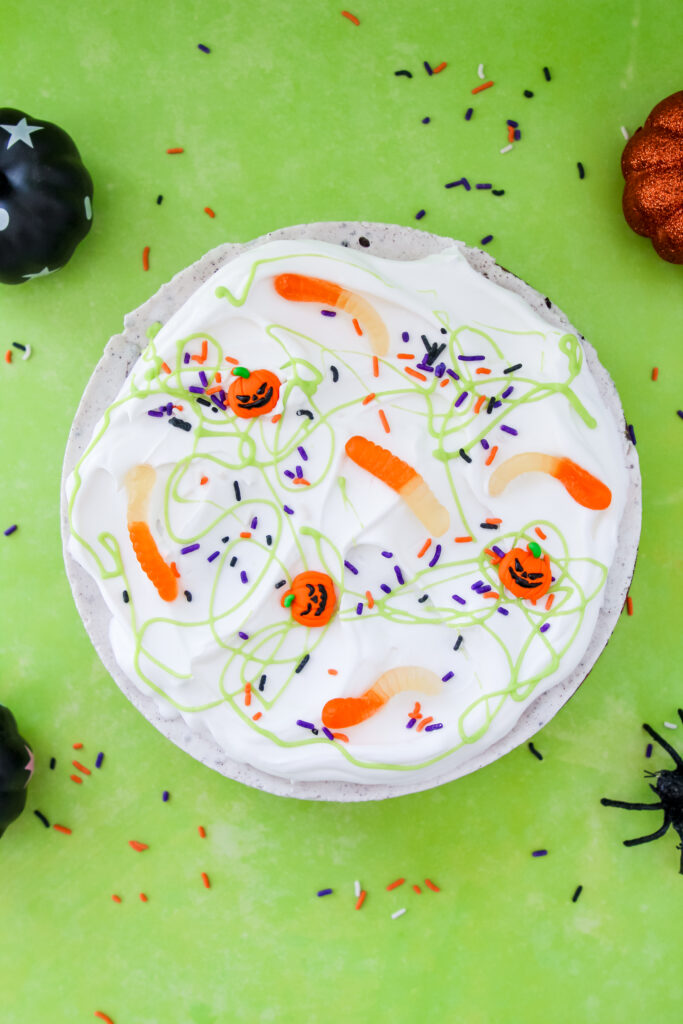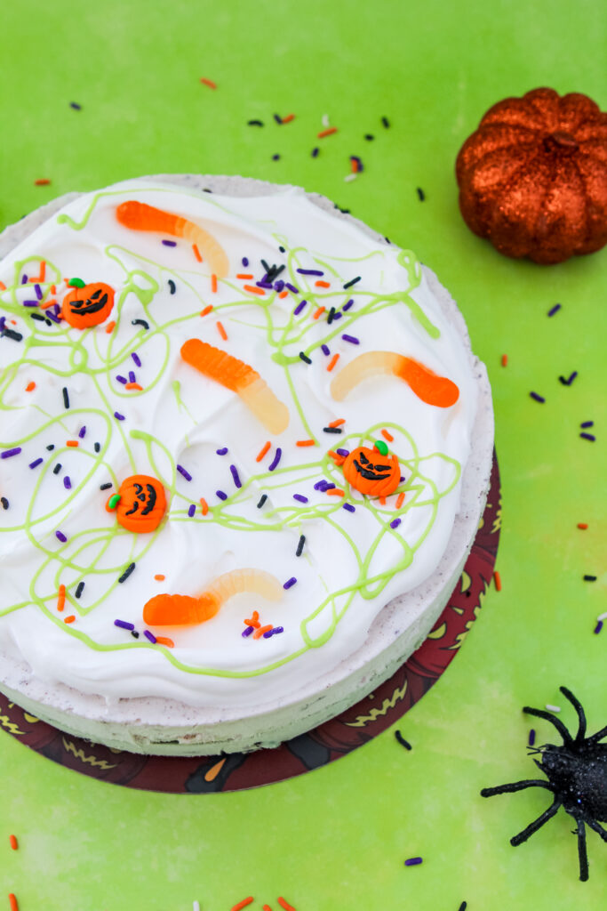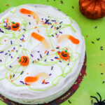 This creepy-crawly cake is inspired by Oogie Boogie the boogeyman from The Nightmare Before Christmas. With its green cookies and cream base, it looks like it came straight from Oogie’s underground lair. Just like Oogie, this cake is spooky, over-the-top, and a little mischievous.