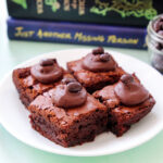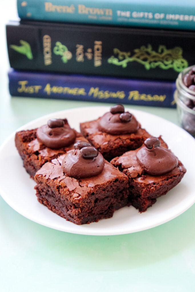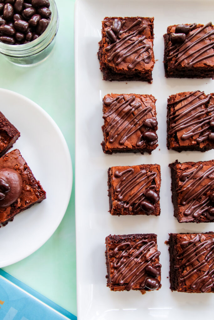 The brownies are rich and deeply chocolatey, with a soft, fudgy center from baking them in a smaller pan. Sweet caramel weaves through each bite, while the raspberry adds a light pop of tartness that keeps things from feeling heavy. The melted chocolate on top adds a smooth finish, and the chocolate-covered espresso beans bring a subtle bitterness and crunch that balance everything out without overpowering the brownie.