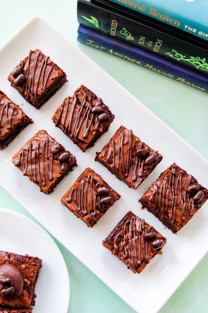 Pause & Discuss Brownies are the kind of dessert that make people stop mid-bite. They’re thick, fudgy brownies baked in a 9-inch pan with swirls of raspberry and caramel running through them. Finished with melted chocolate and crunchy chocolate-covered espresso beans, they’re perfect for a book club spread.