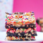 Birthday Cake Oreos filled with edible cookie dough, dipped in chocolate, and topped with rainbow sprinkles!