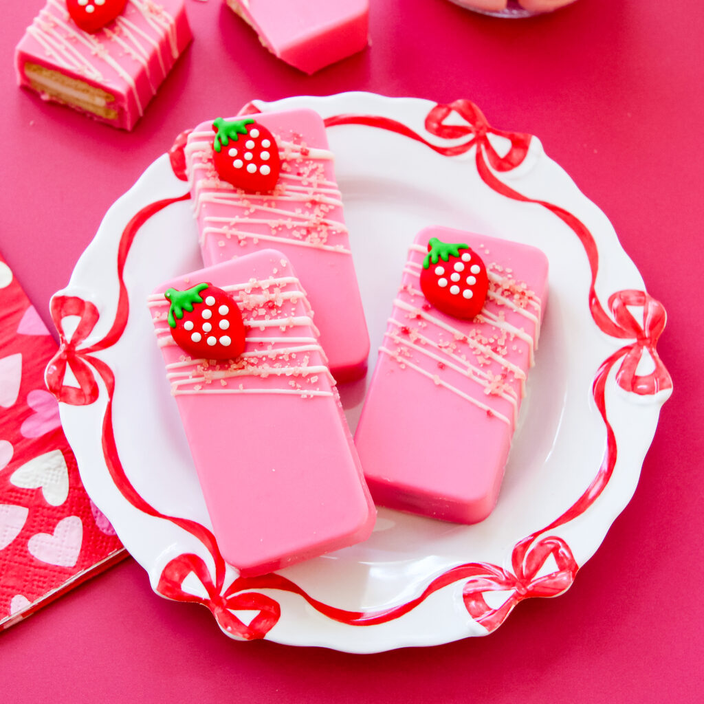 These Pink Sugar Strawberry Cookies are a perfect Valentine’s treat. A crisp cookie is set into a chocolate mold, coated in pink chocolate, then finished with a white chocolate drizzle and a sprinkle of strawberry sugar and royal icing. They’re sweet, eye-catching, and a ton of fun.