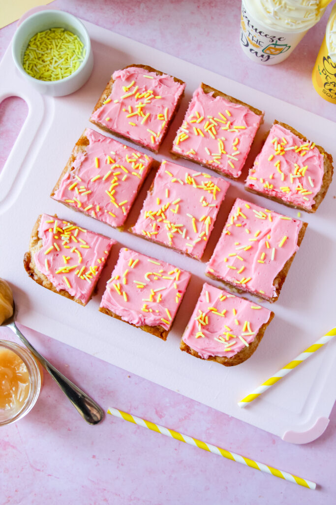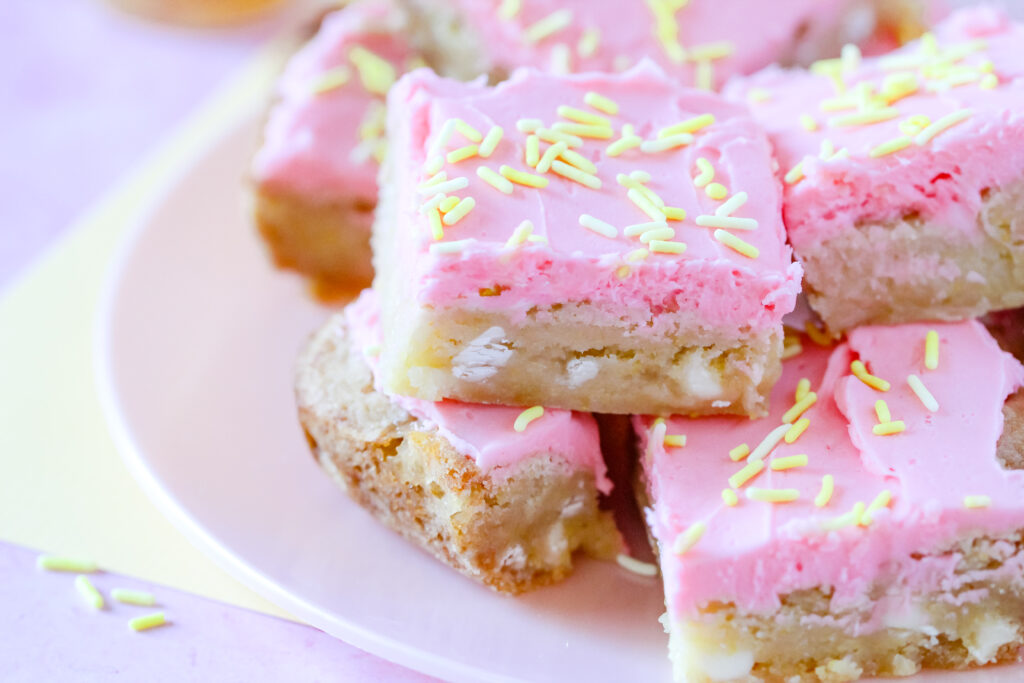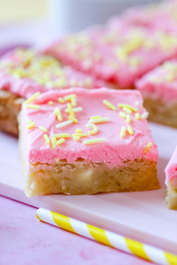 Enjoy these Porch Swing Pink Lemonade Bars outside on a warm afternoon with a tall glass of pink lemonade and a classic porch activity—rocking in a swing, playing a card game, or sharing stories with friends. For extra fun, set out a big pitcher of pink lemonade and striped paper straws so everyone feels like they’re at a summer lemonade stand.