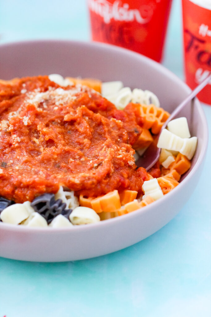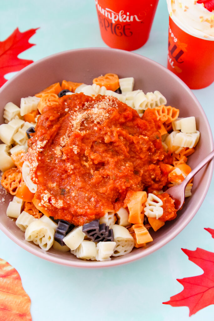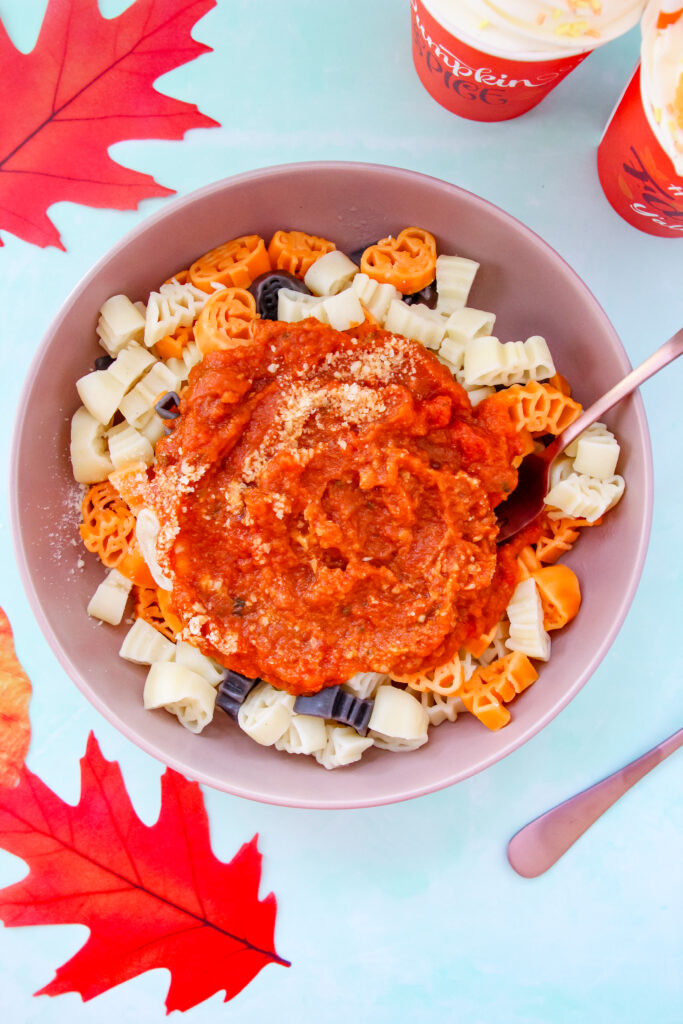This sauce pairs well with penne, rigatoni, or spaghetti, but fun fall pasta shapes make it extra fun.
