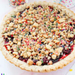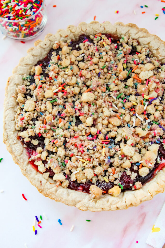 While the pie cools, mix the crushed cookies, melted butter, and sprinkles together to make the crumble.