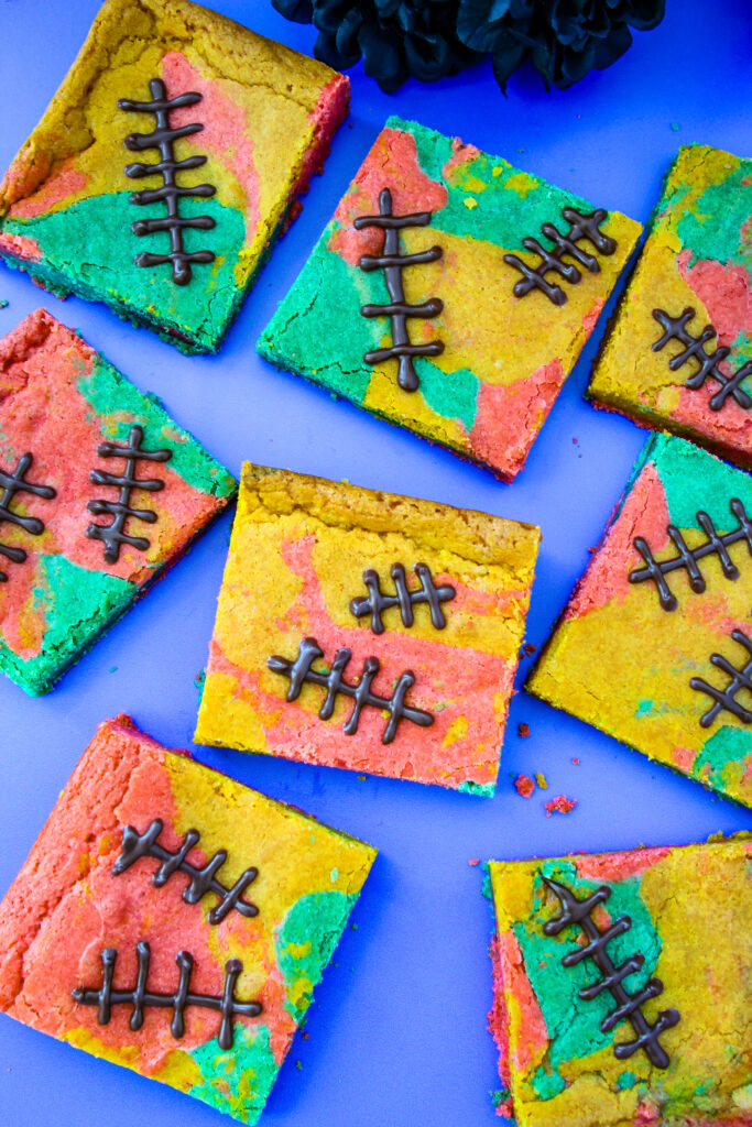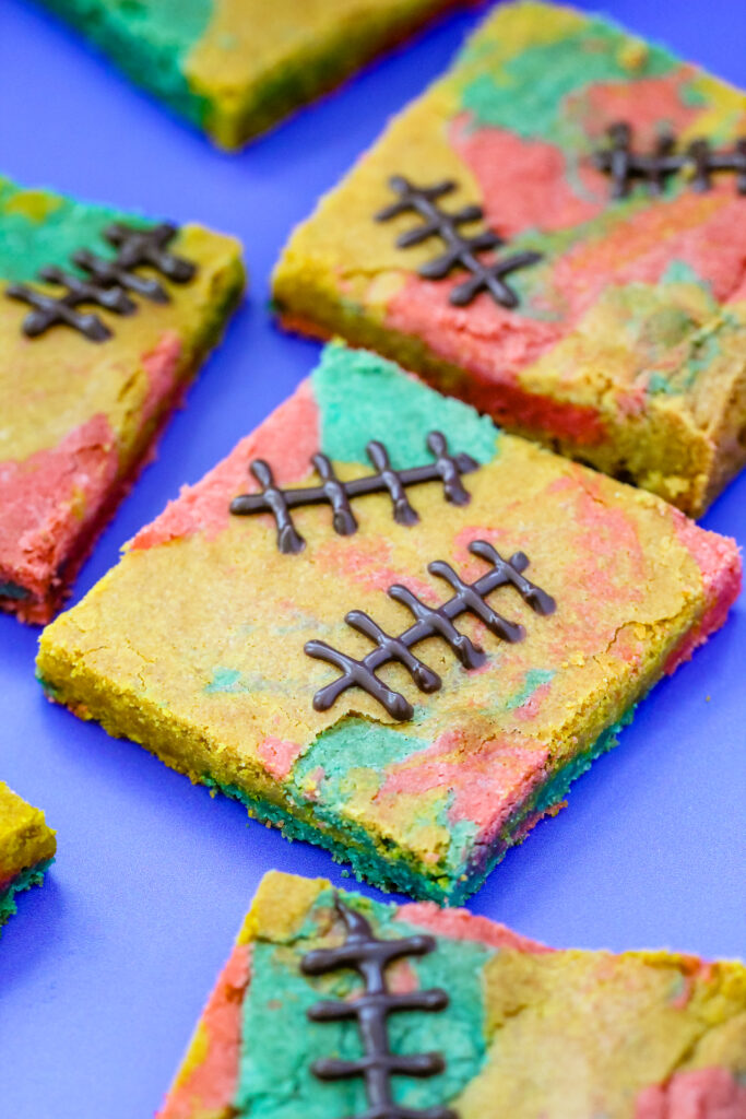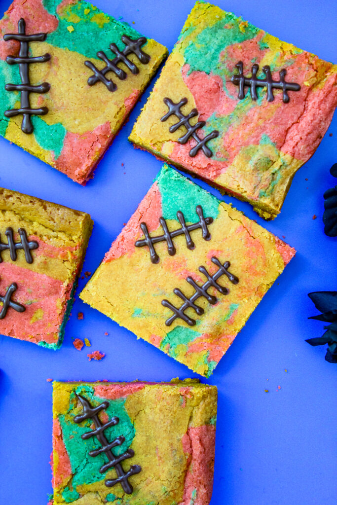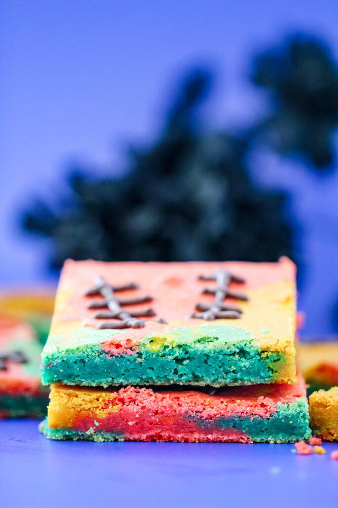 These patchwork blondies look like they were stitched together straight out of Dr. Finkelstein’s lab, just like Sally herself. With three colorful batters swirled into a quilt-like design and chocolate stitches piped on top, they capture her sweet yet stitched-together spirit perfectly.