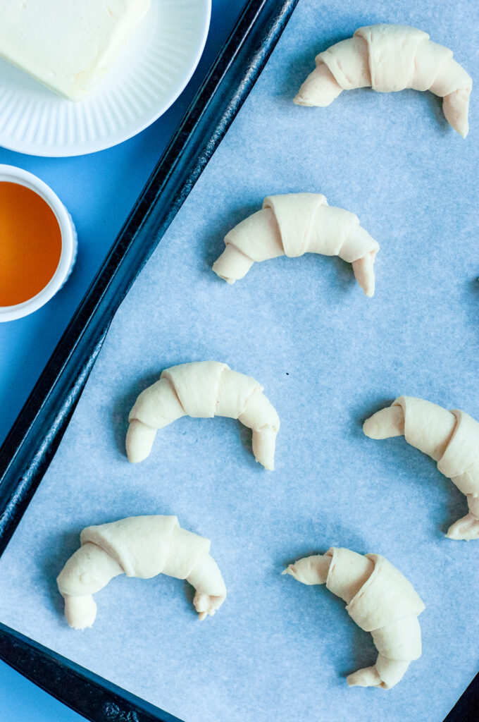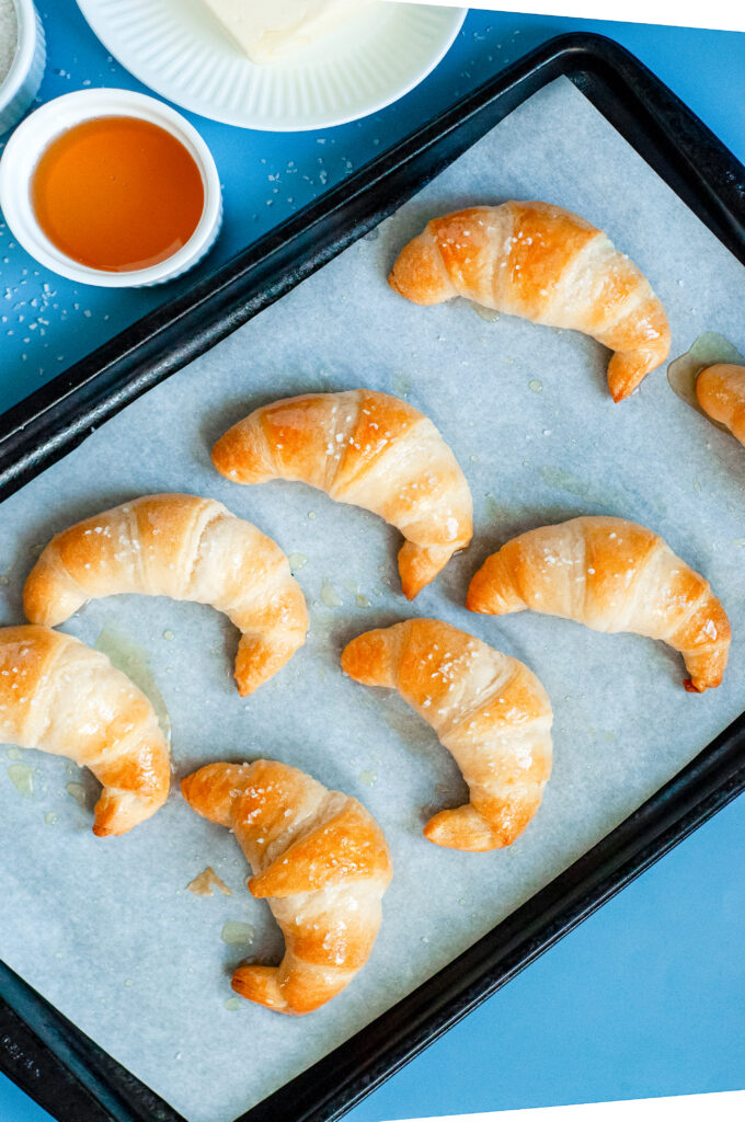 You can roll the crescents and store them in the fridge for a few hours before baking. Brush with honey butter and sprinkle salt just before serving.