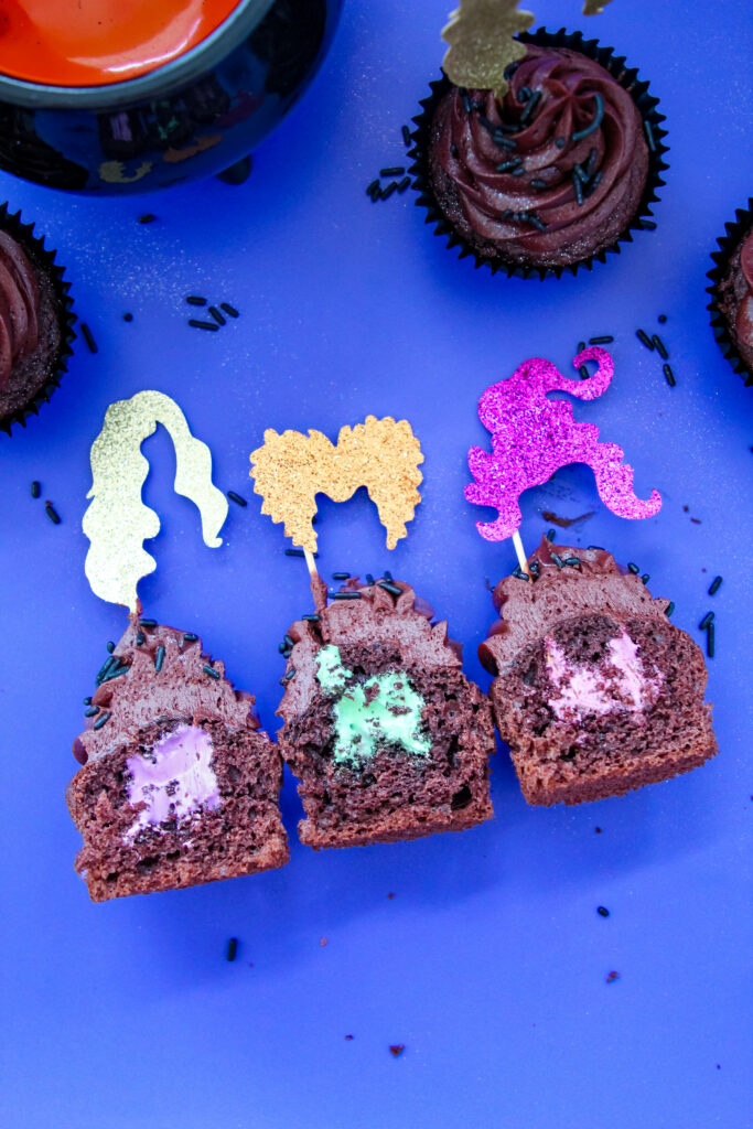 Absolutely! Bake and fill them the day before your Hocus Pocus night, then frost and decorate the next day to keep them soft and fresh.