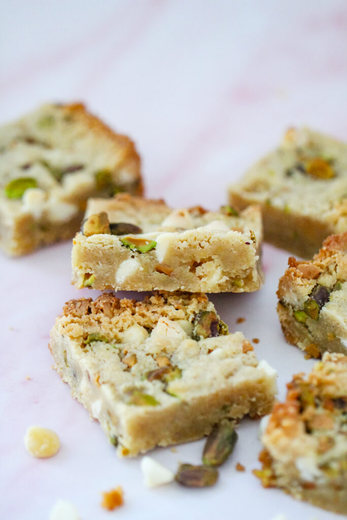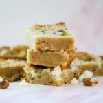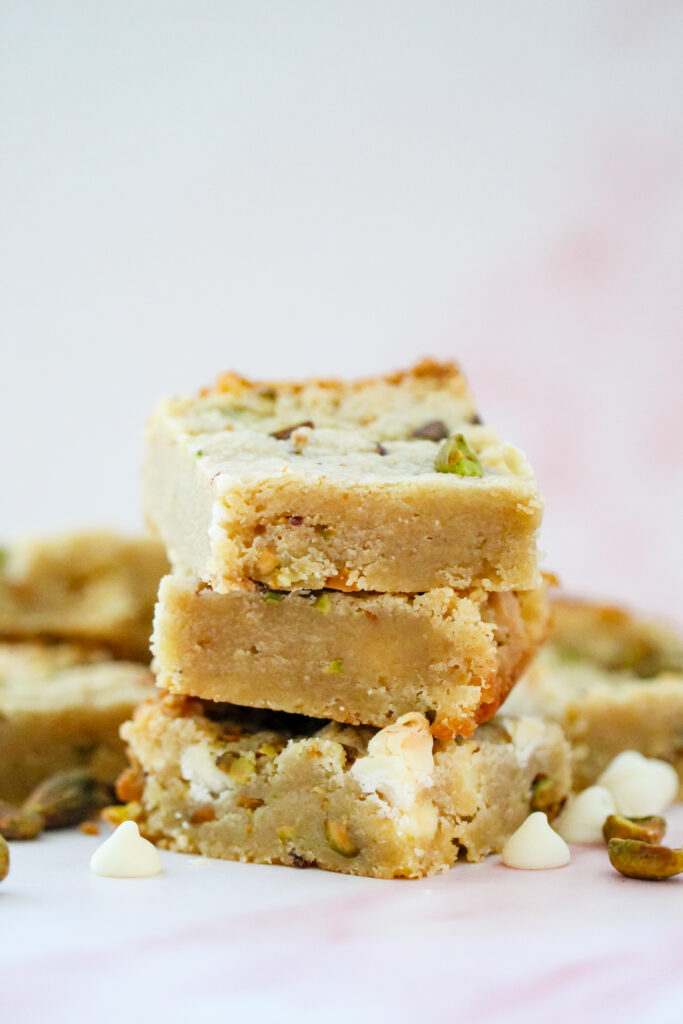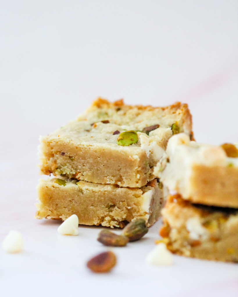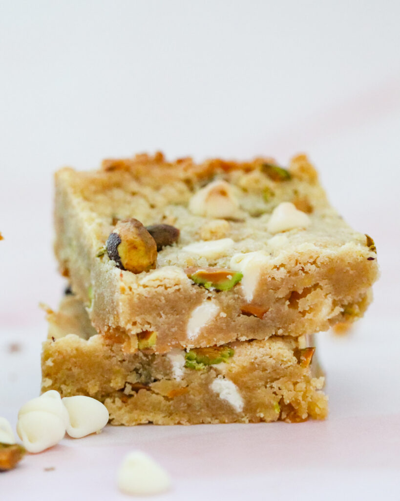 These blondies are rich from the melted butter and brown sugar, which gives them that soft, slightly chewy center. The pistachios add a subtle roasted nuttiness and just enough crunch. The white chocolate melts into creamy little pockets that balance the salty notes perfectly. The edges bake up lightly crisp while the center stays tender and dense.