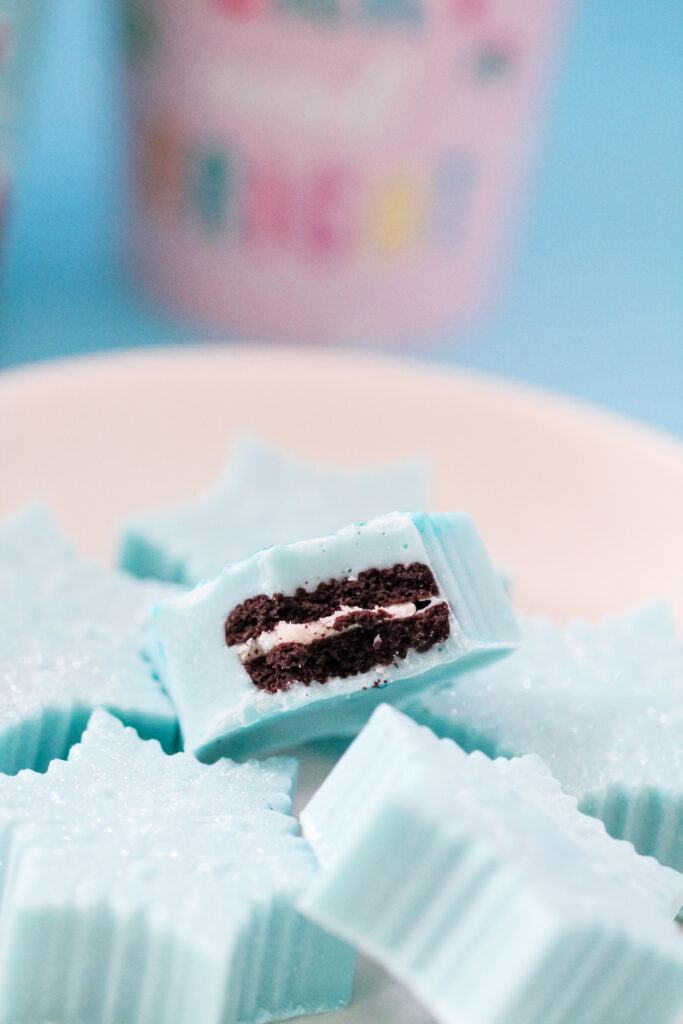 These Sparkly Snowflake Mini Cookies look straight out of a winter wonderland, but they’re secretly one of the simplest holiday treats you can make. A smooth white chocolate shell tinted icy blue wraps around a mini Oreo, then everything gets finished with shimmering edible glitter for that extra sparkly glow. Since there’s no baking involved, they come together quickly and make a gorgeous addition to cookie trays, party platters, or cute homemade gift boxes when you need something sweet that feels a little magical.