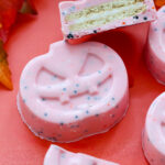 Sprinkled Pink Pumpkin Covered Cookies are Halloween treats with a fun pink twist. They look like adorable little jack-o-lanterns, and once you bite in, you find a Golden Oreo surrounded by sprinkle-studded chocolate. They deliver Halloween sweetness without any of the scare.