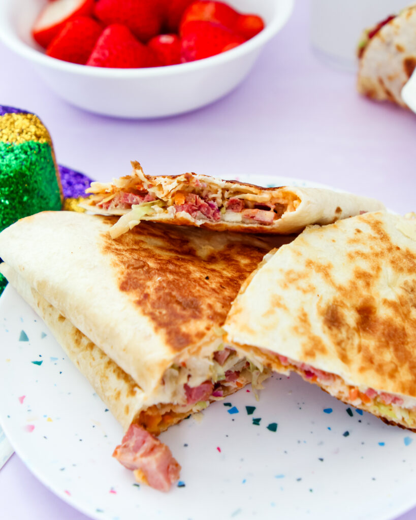 Rye bread is replaced with a soft flour tortilla and pressed until golden and crisp. That single swap transforms a traditional Reuben-style sandwich into something crunchier on the outside, extra melty inside, and much easier to slice and share. All the classic pub flavors stay intact, just with a texture that feels fresh and a little more fun.
