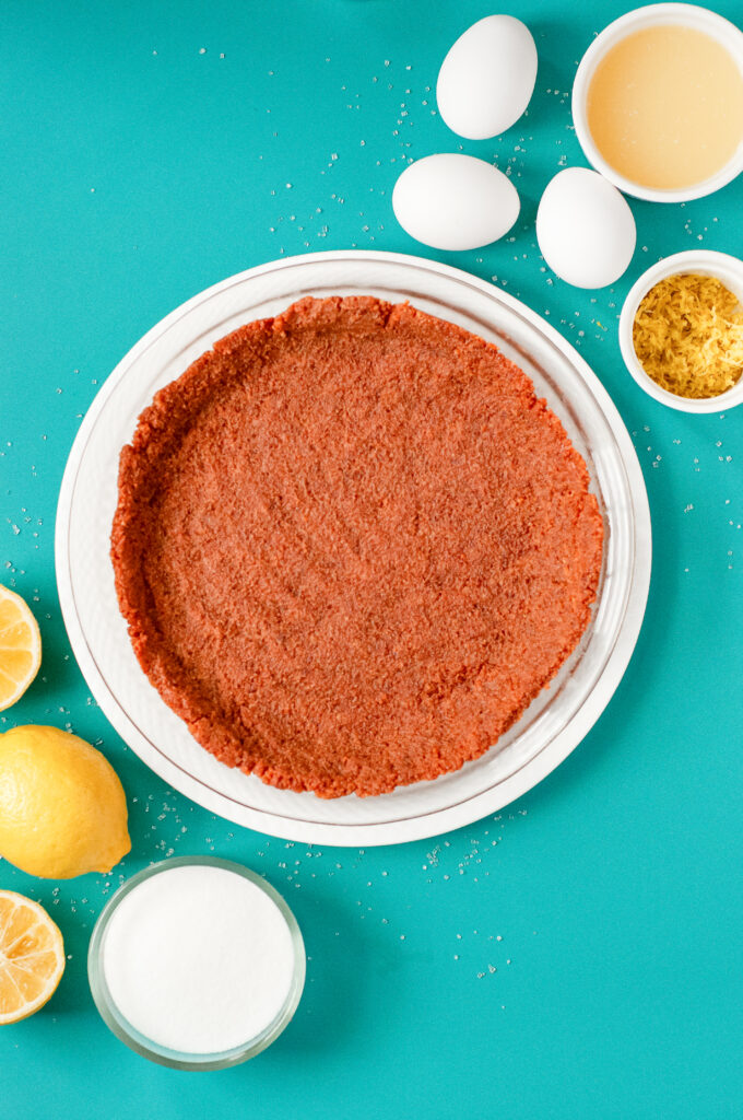Only the crust is pressed and chilled. The filling is cooked on the stovetop and then refrigerated to set.