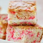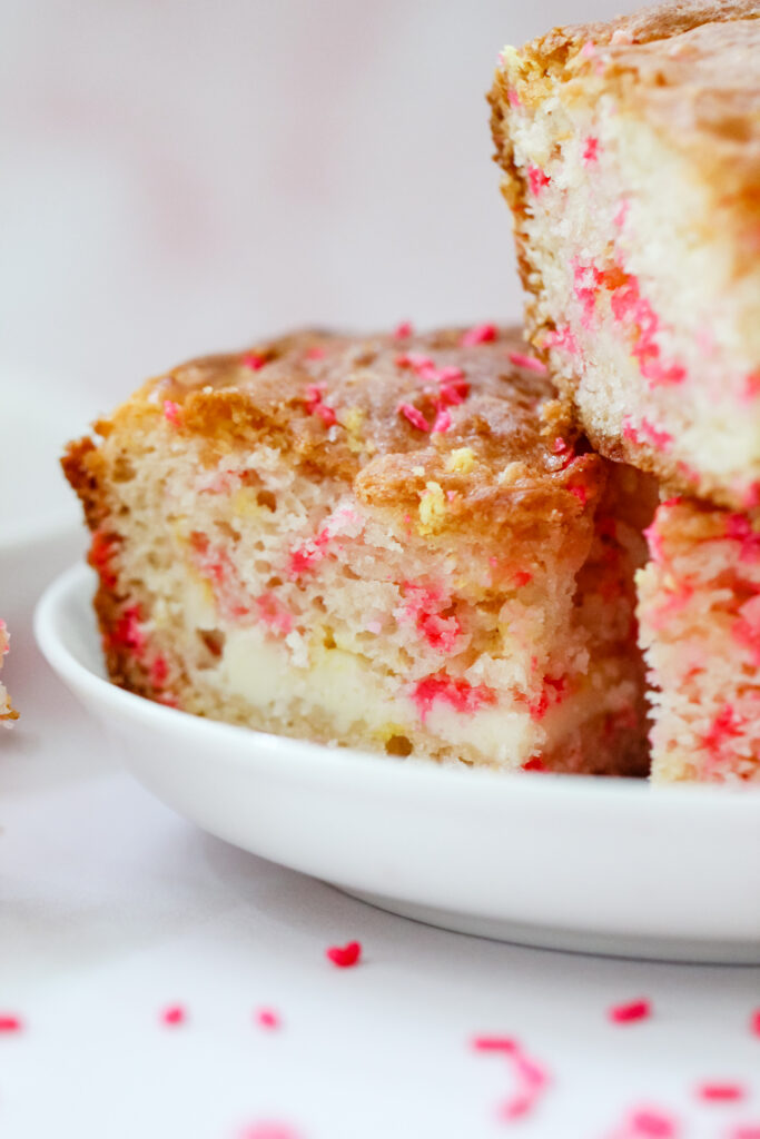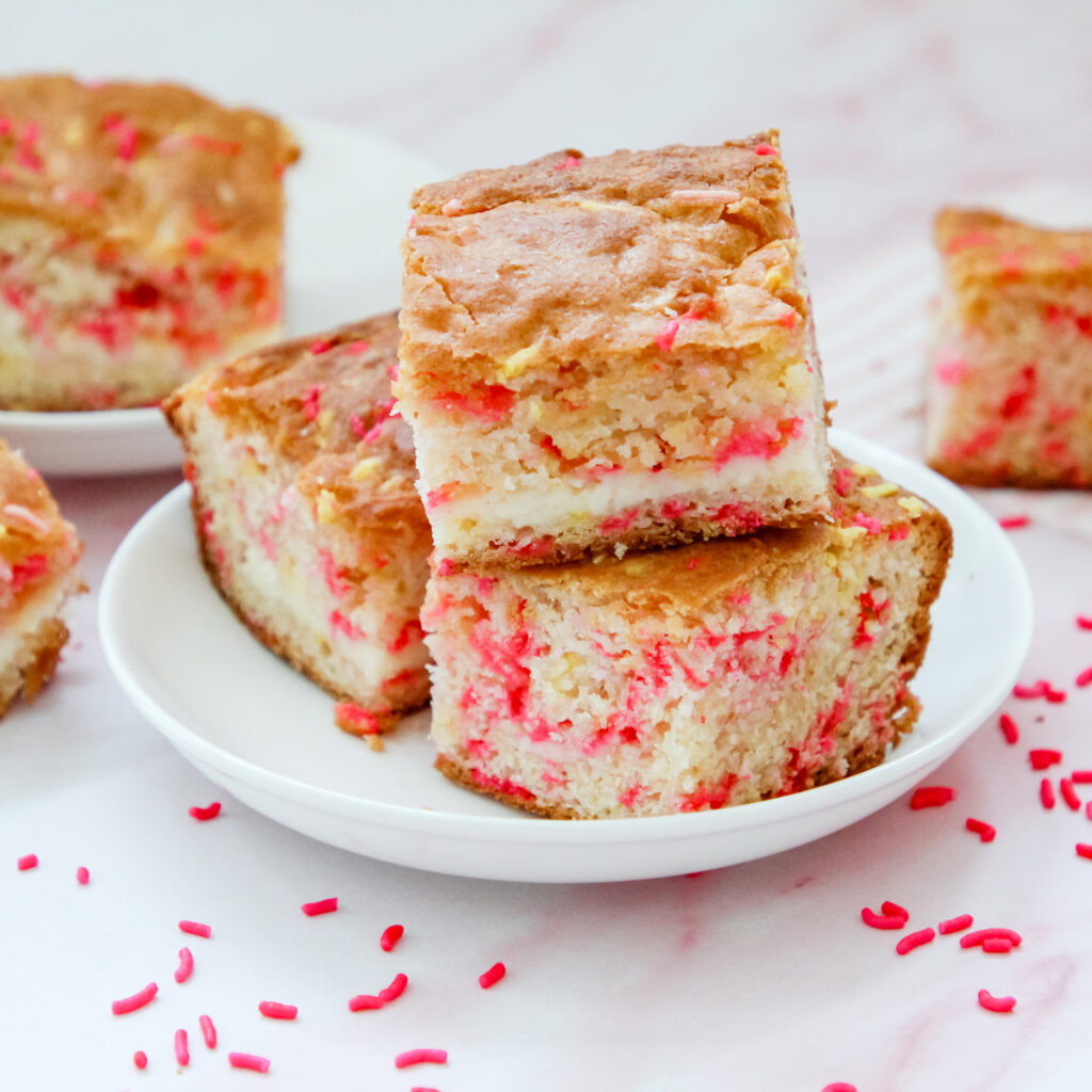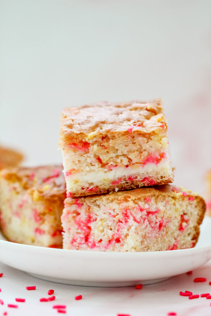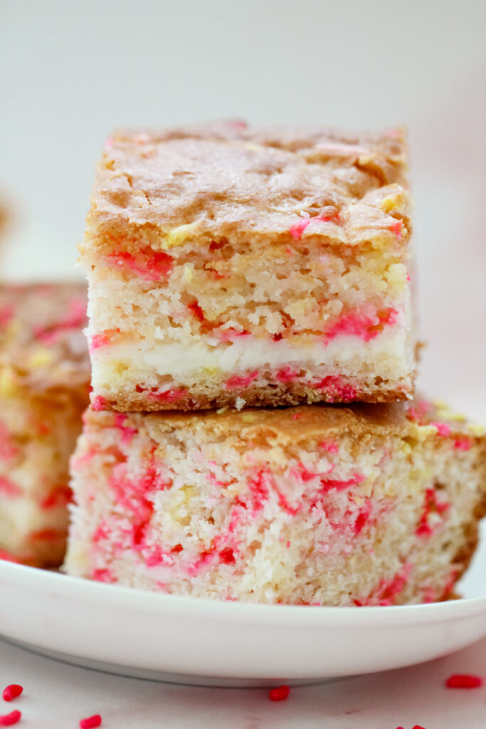 These bars are soft and rich with a buttery vanilla base, balanced by fresh lemon flavor from both zest and juice. The center adds a smooth, lightly tangy creaminess that cuts through the sweetness just enough. The glaze on top brings a simple sweetness that ties everything together, while the sprinkles add a tiny crunch and that signature pop of fun.