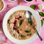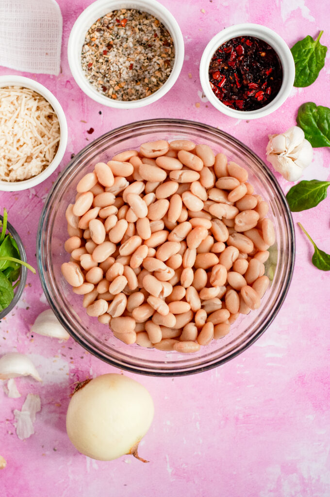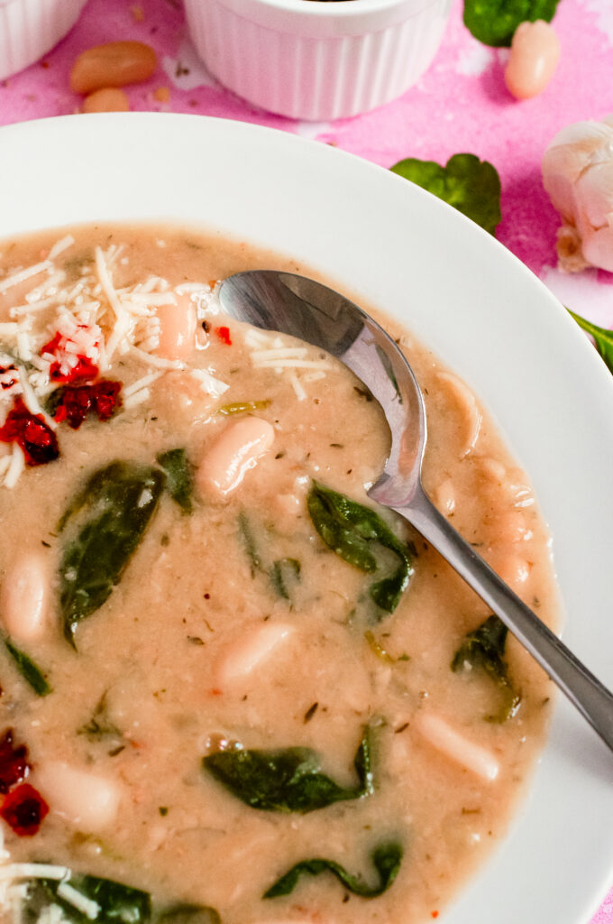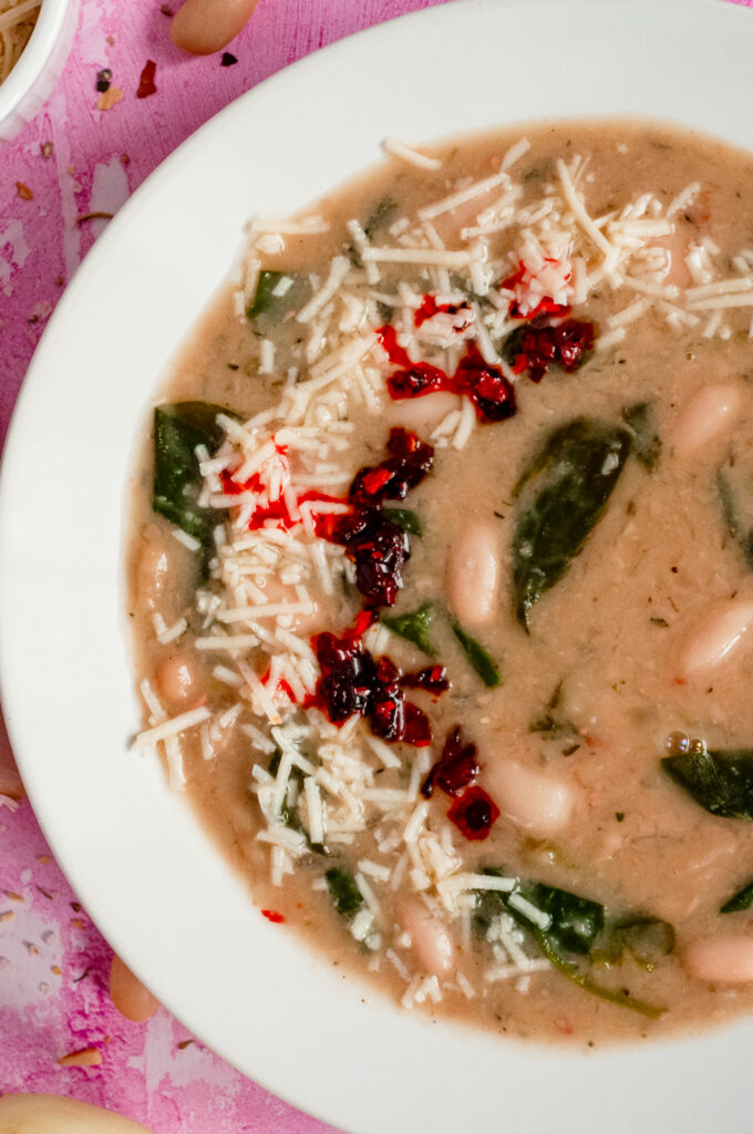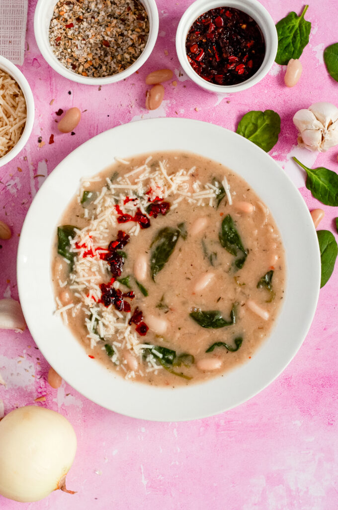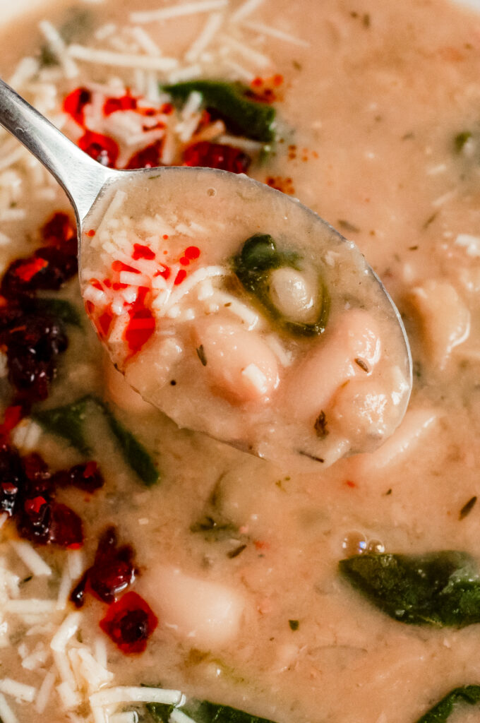 This soup is savory, creamy, and layered. The cannellini beans give it a naturally velvety texture once lightly mashed. Garlic and shallot create a warm base, while thyme adds a soft herbal note. The apple cider vinegar brightens everything so it doesn’t taste flat. Spinach keeps it fresh. Parmesan adds salty depth. The chili oil brings gentle heat and a little richness that ties it all together.