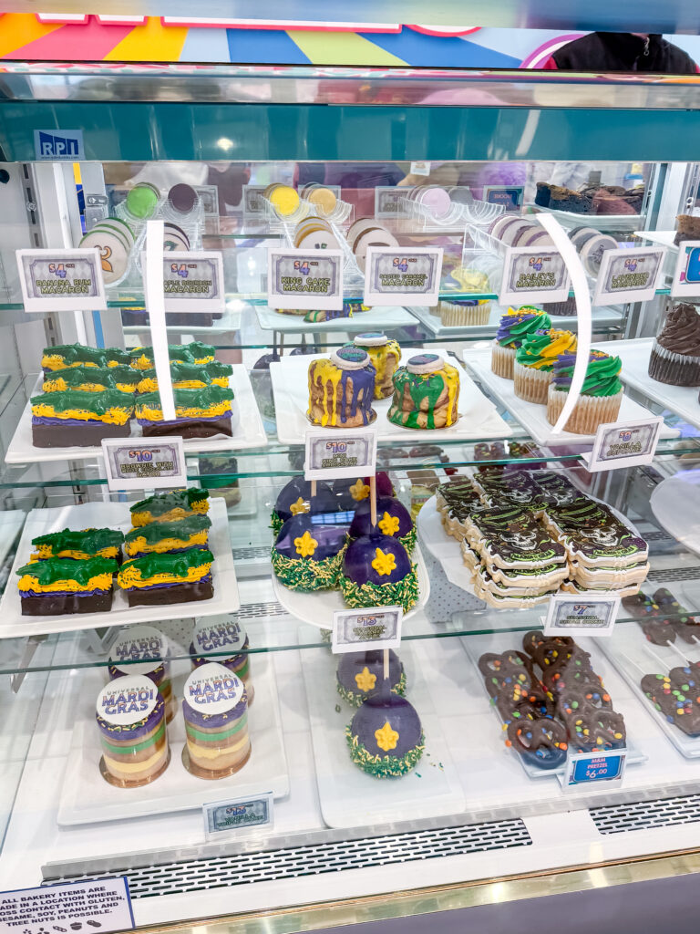 Inside the shops, there are displays completely themed with decorated caramel apples, brownies, and cupcakes, all in classic Mardi Gras colors.