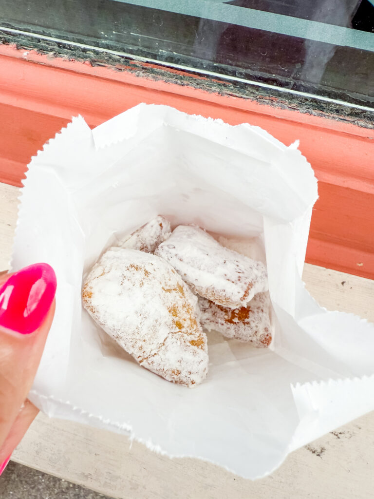 They’re served hot in a paper bag, and you shake them up with powdered sugar before opening, which is mind-blowingly amazing.