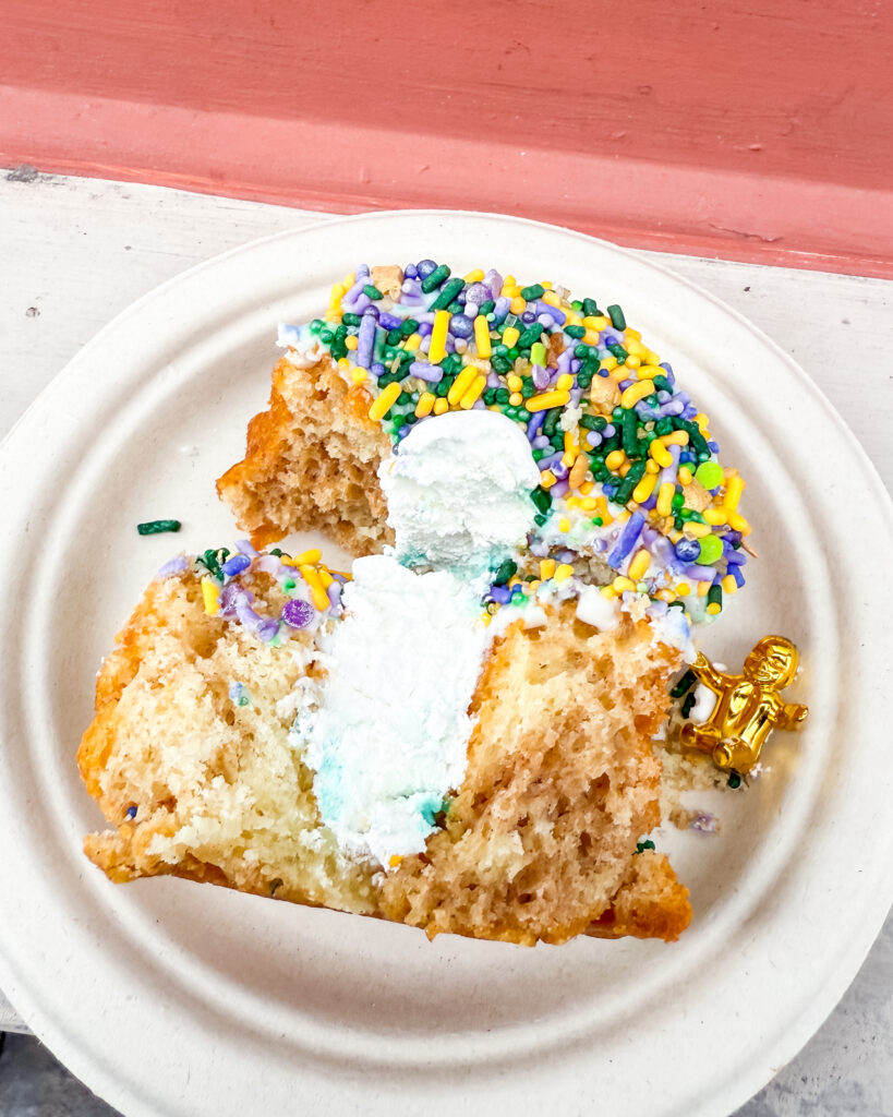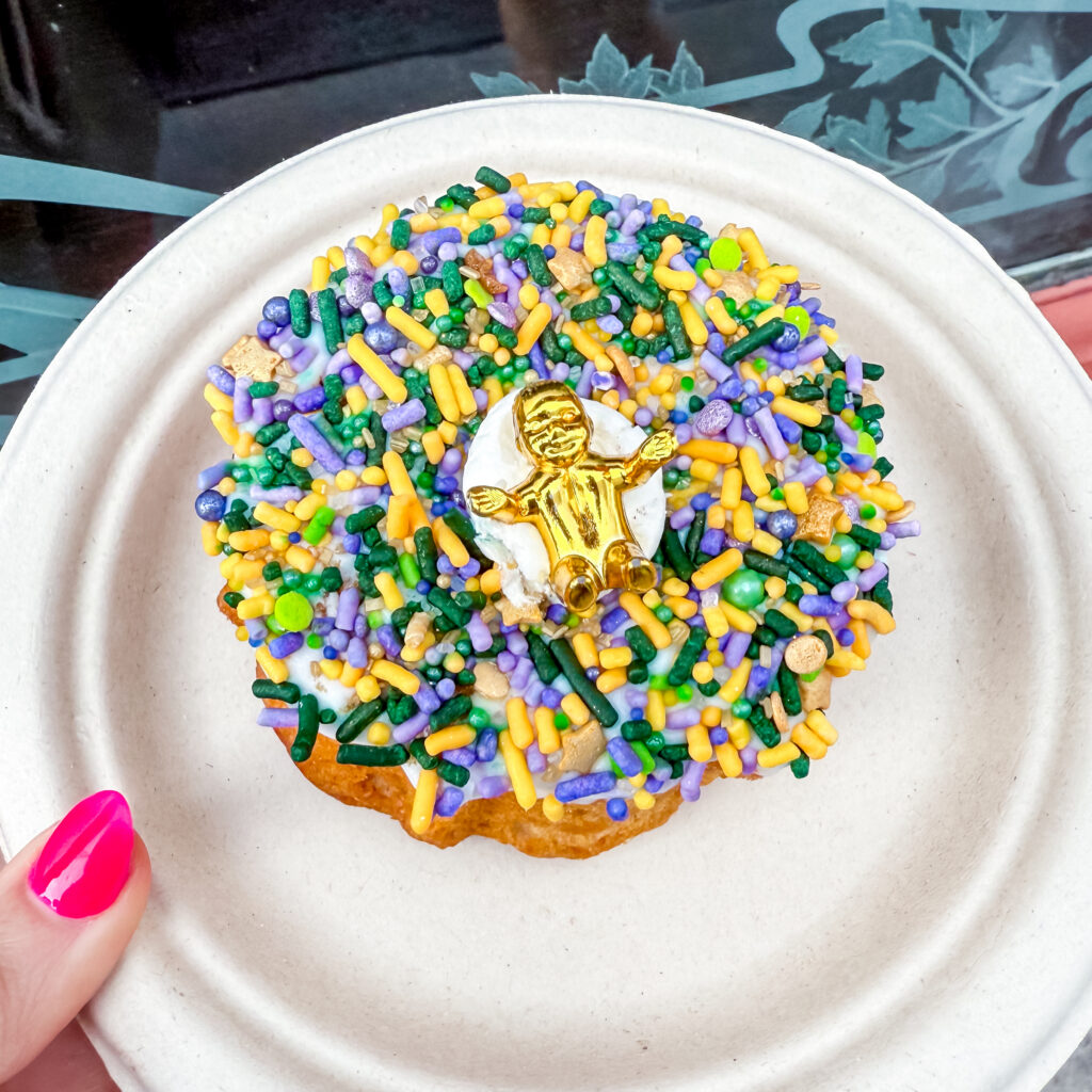 The King Cake instantly stands out because, ahem, it’s covered in sprinkles. The gold Mardi Gras baby on top adds a little fun, but the flavor absolutely holds up.
