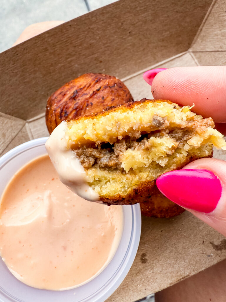 The Pastelón Fritters are crispy on the outside, filled with sweet plantains and seasoned picadillo beef, and served with mayo ketchup for dipping.